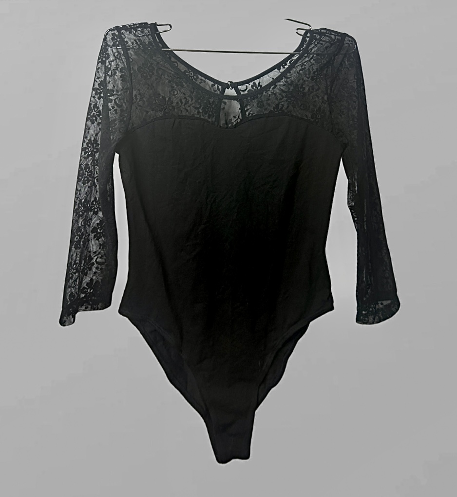 חדש לגמריי! בגד גוף לייקרה בצבע שחור מידה S בשילוב תחרה מחשוף סירה עגול באזור החזה סגירת טיקטקים למטה!