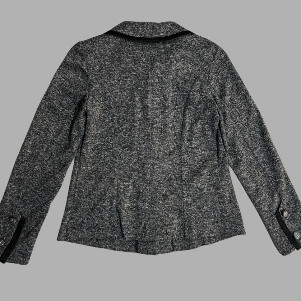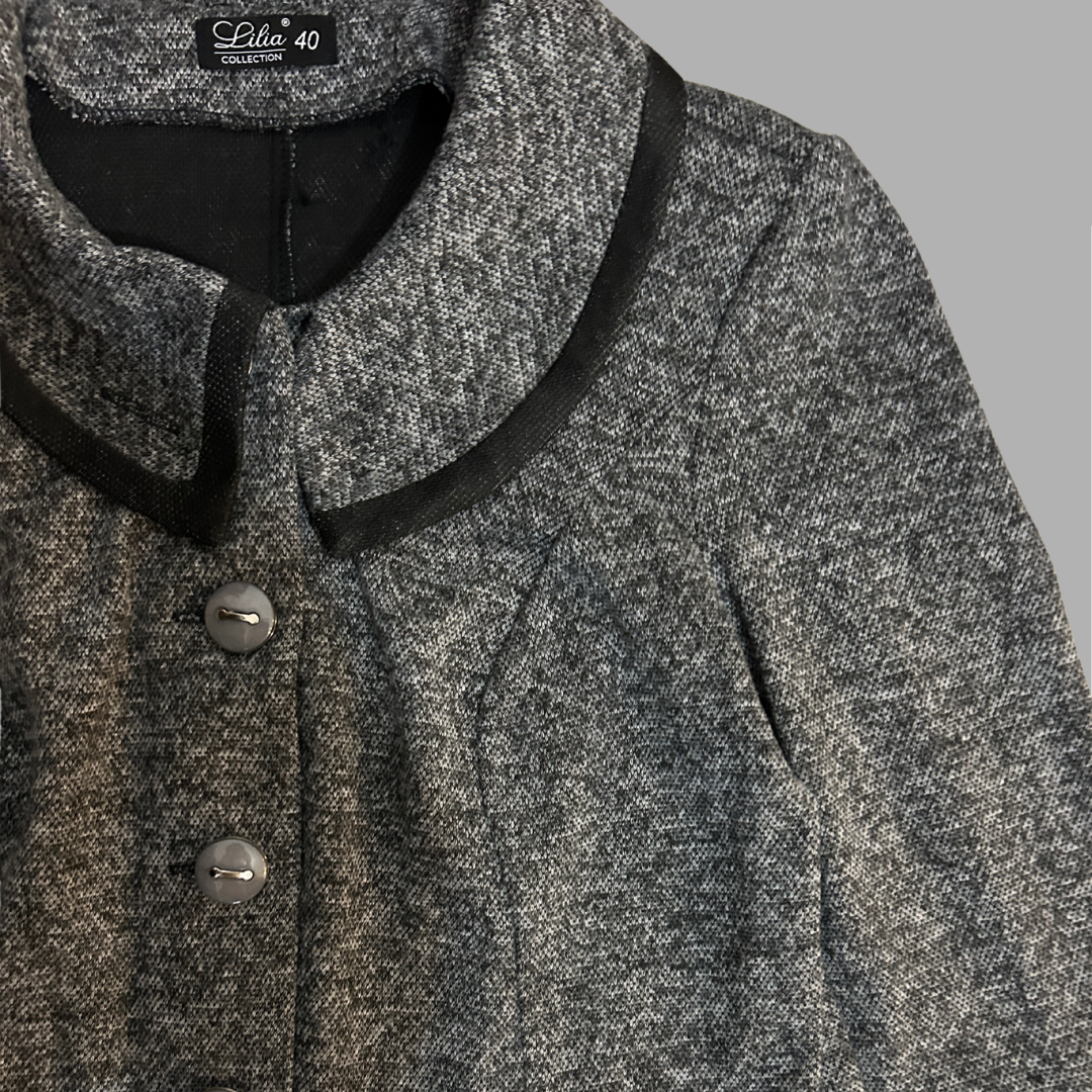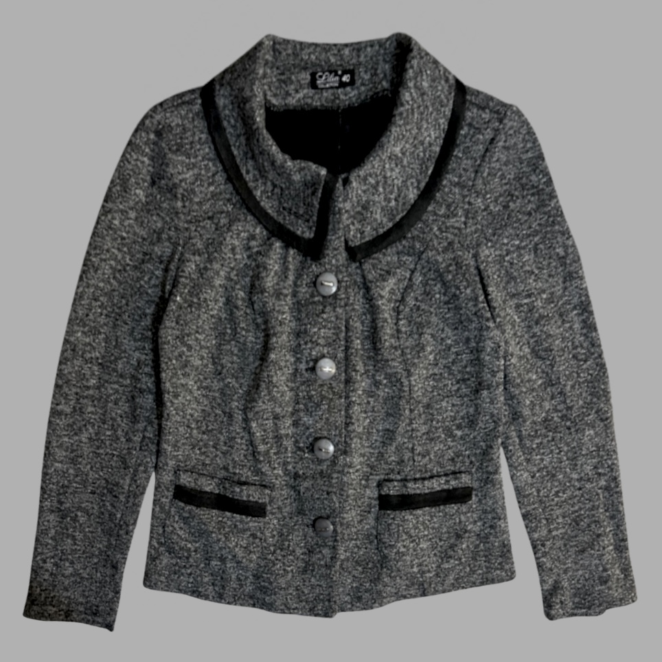 ג׳קט אפור סרוג מידה 40 ׳רטרו׳ עם כריות כתפיים עדינות עם כפתורים וצווארון בובתי וכיסים קדמיים