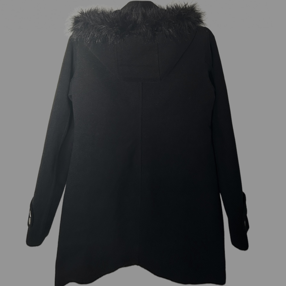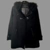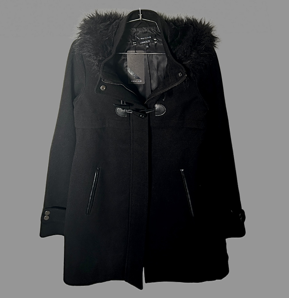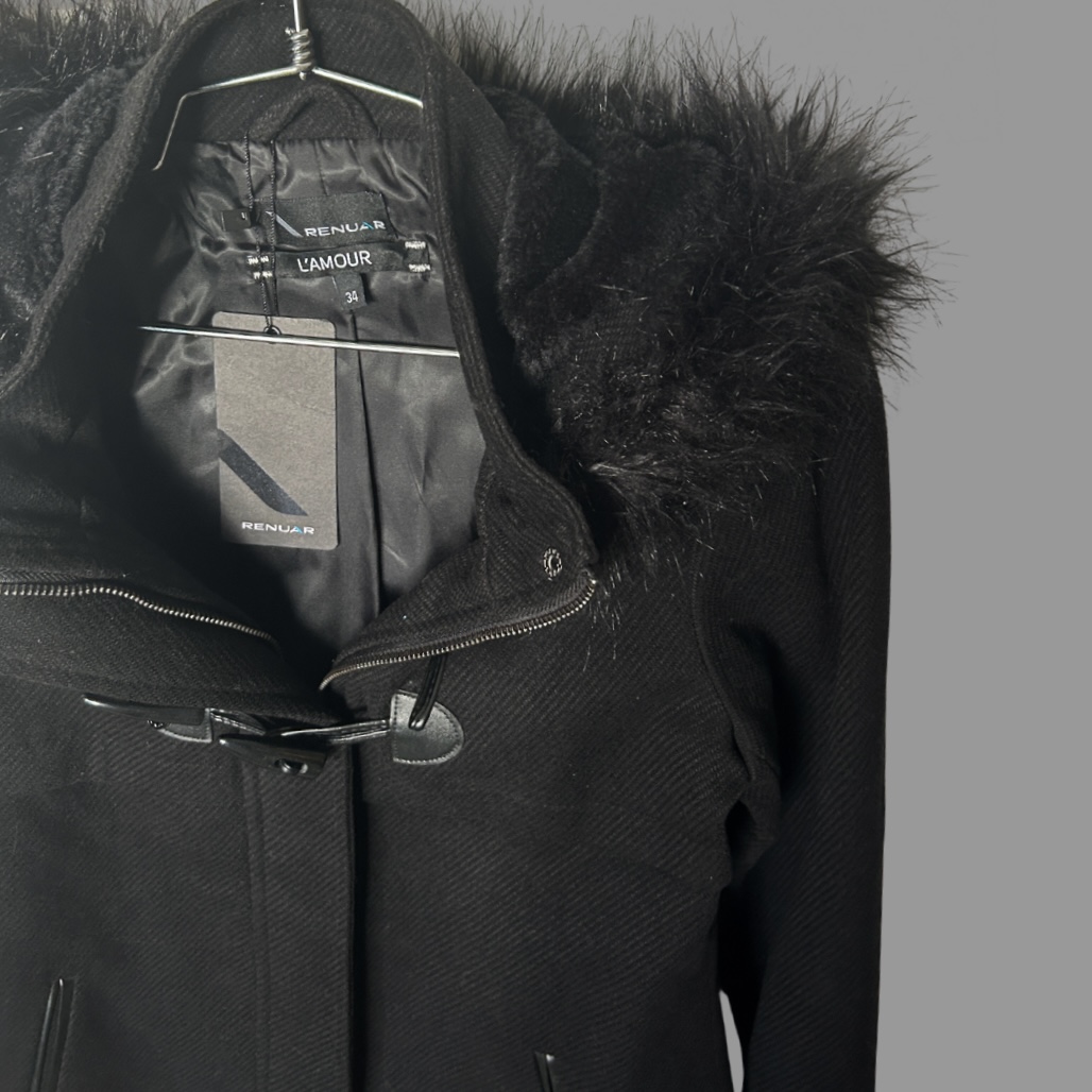 עם טיקט! RENUAR מידה XS מעיל אלגנטי שחור ארוך עם כובע פרווה