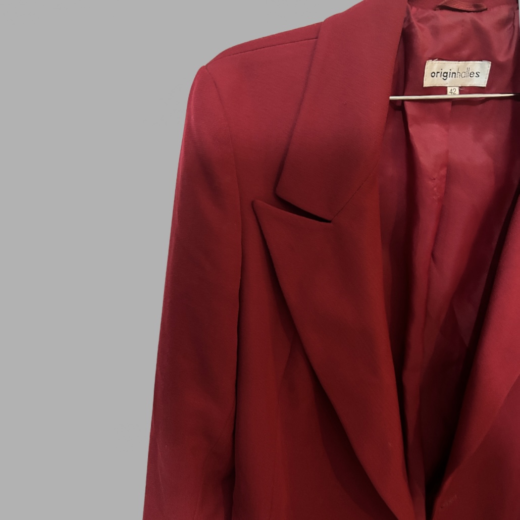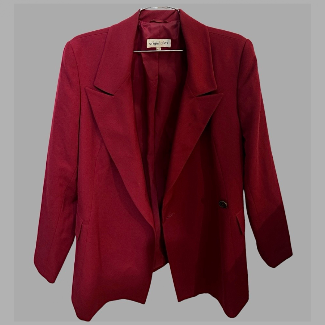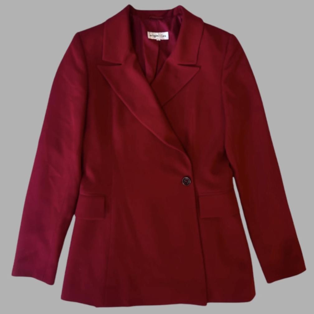 Origin halles בלייזר מחויט מידה S-M אדום יין עמוק עם צווארון מוצלב, כריות כתפיים עדינות וכפתור אחד לסגירה,