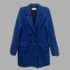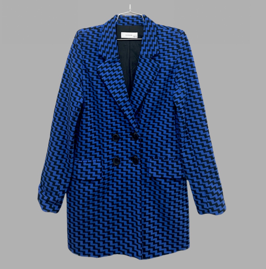 אורך – 87 ס״מ, היקף 100 ס״מ בלייזר מוצלב בגזרת אוברסייז בצבע כחול רויאל עם הדפס שחור, עם כריות כתפיים עדינות וגזרה מחמיאה ושימושים עם כל אאוטפיט! של חברת ״רזרבד״ מבד ג׳רסי עבה ואיכותי! לייקרה