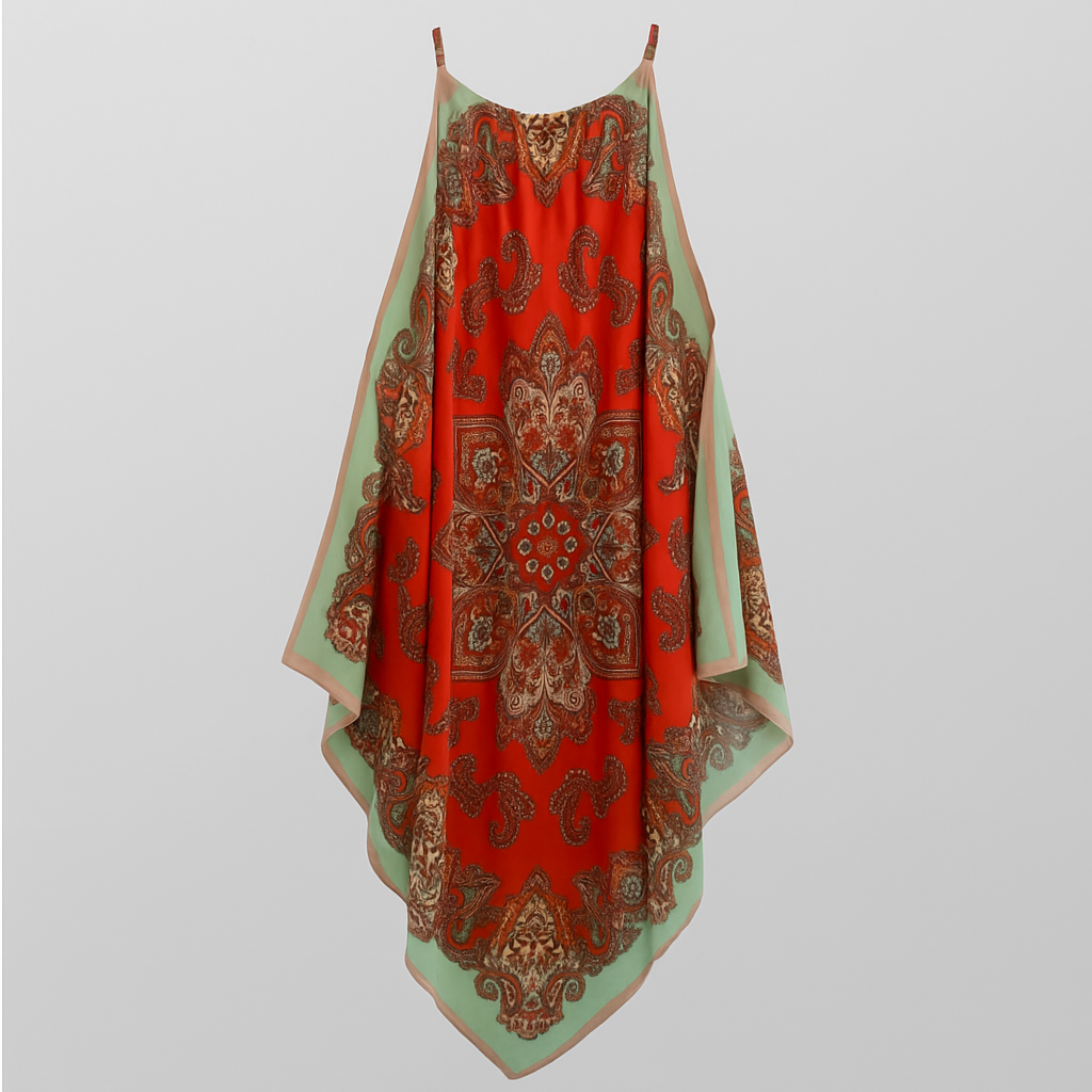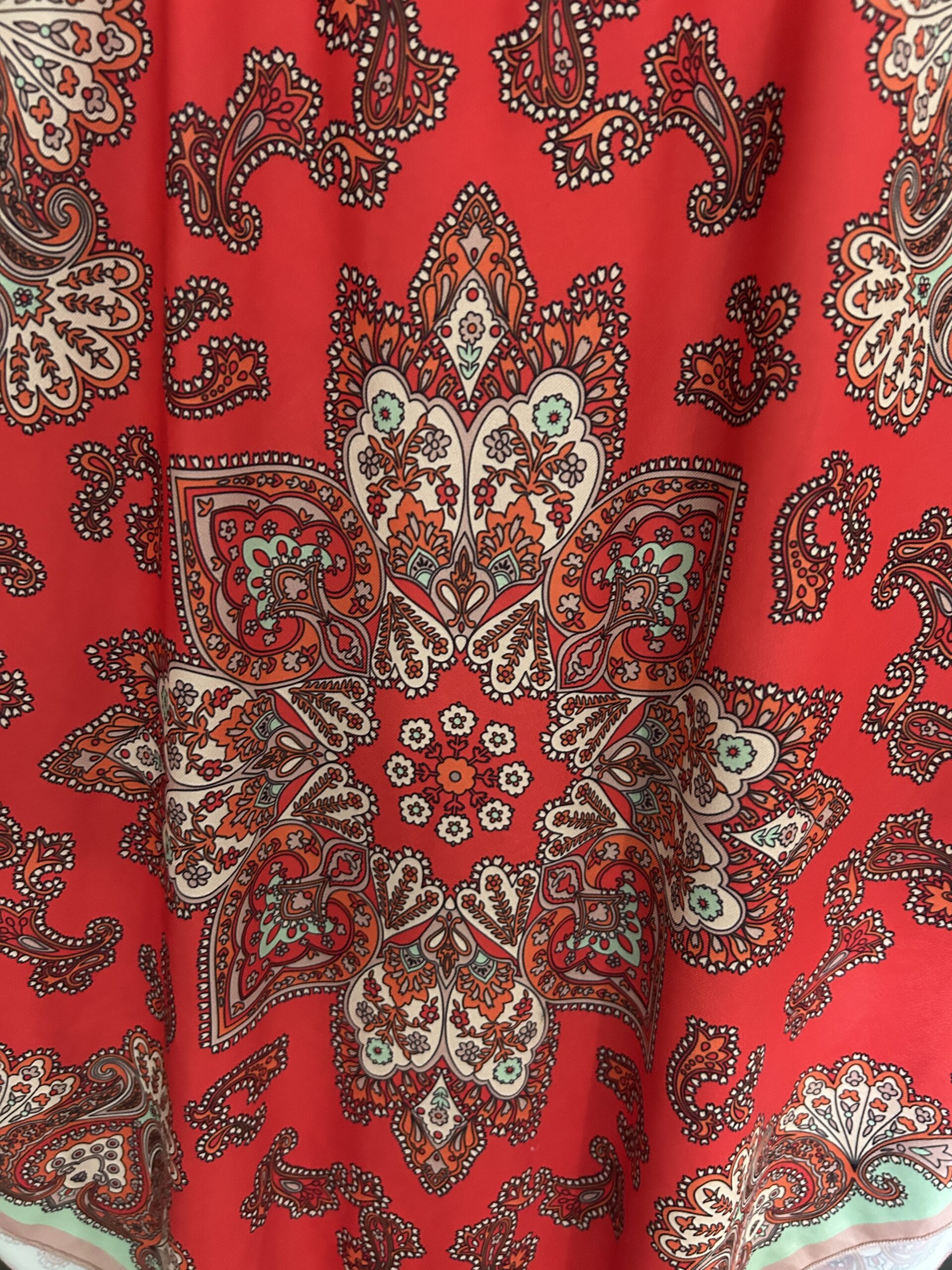 גופיית בוהו שיק מהממת עם הדפס מדמנדלה אתני בגווני אדום וטורקיז, גזרה א-סימטרית קלילה ונשפכת, שתשדרג כל לוק קייצי ותשאיר רושם של חו”ל. מושלמת לחופשות, פסטיבלים או לוק יומי שכולו סטייל חופשי