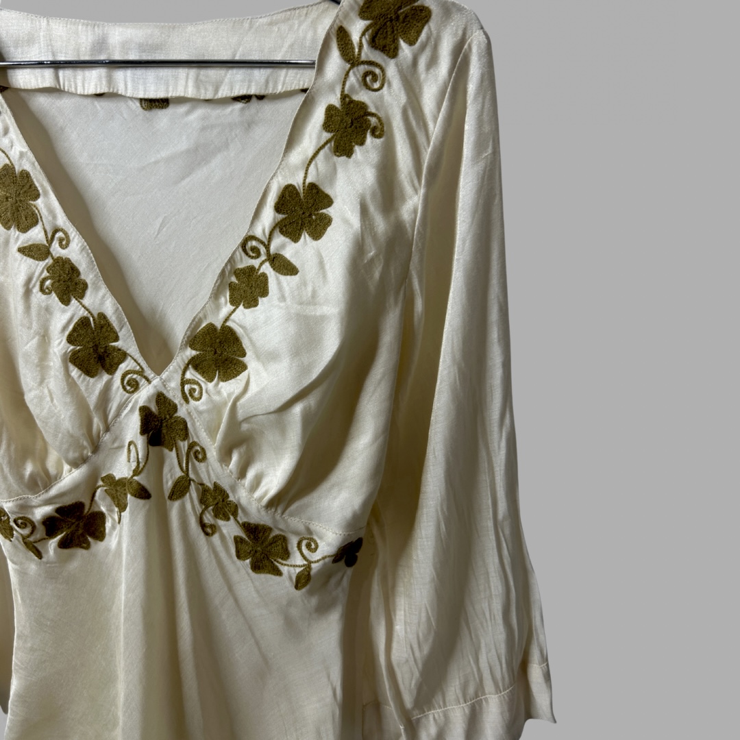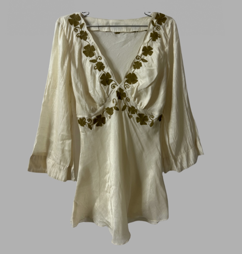 המחשוף בצורת וי, עם רקמת פרחים עדינה בצבע ירוק זית, מוסיף מגע רומנטי וקסם של עבודת יד. זו חולצה שמצליחה לשלב אלגנטיות עם נינוחות, ומתאימה באופן מושלם למראה יום מתוחכם או ליציאה ערב קלילה עם טאץ’ חגיגי.