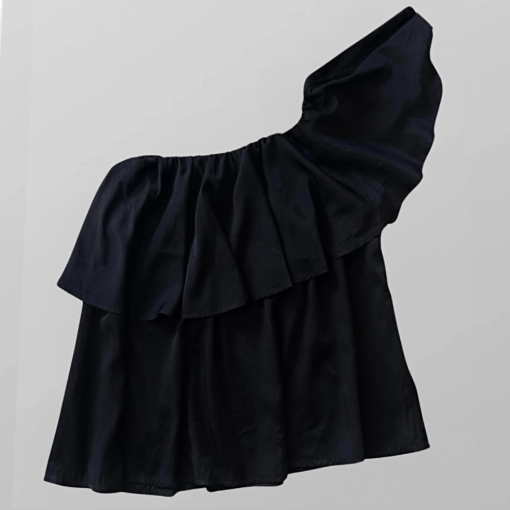 איך יושבת חולצת כתף אחת אוברסייז על הגוף? בזכות הבד הנשפך, היא יוצרת תנועה רכה וזורמת – ומתאימה לכל מבנה גוף.