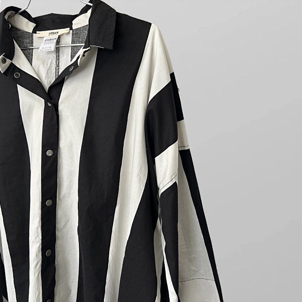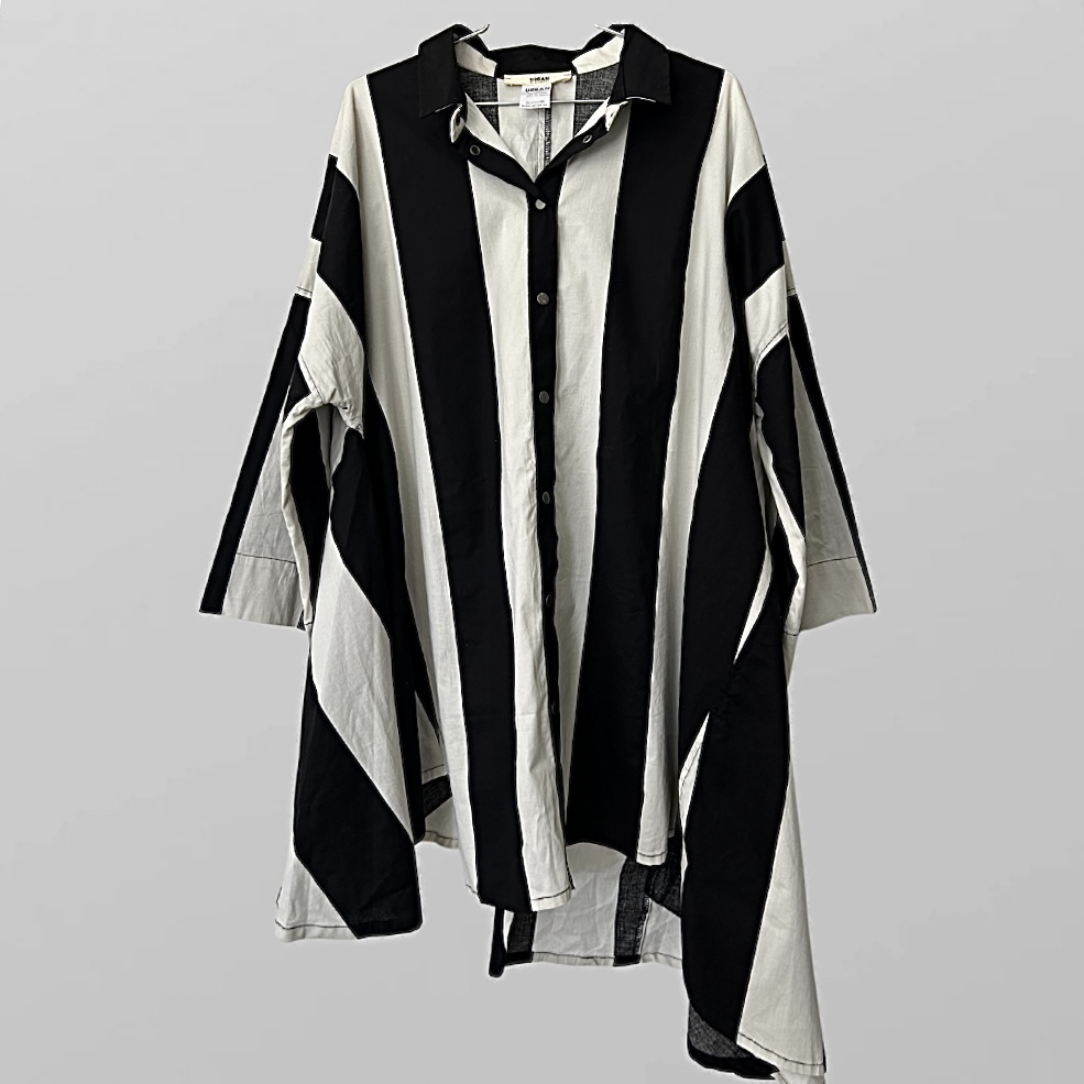 היקף- 160 סמ, אורך – 75 סמ חולצת אוברסייז מכופתרת ורחבה מאוד ארוכה ומחמיאה עם הדפס פסים עבים, כפתורים לכל האורך וא-סימטרית מידה XL-XXL