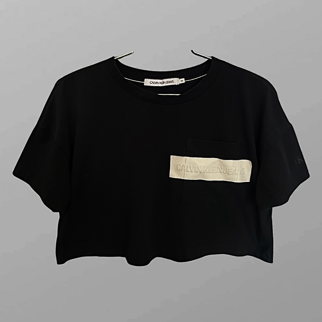 אורך – 35 ס״מ, היקף – 96 סמ חולצה שחורה בגזרה קרופ עם לוגו לבן של המותג, טישרט קרופ של קלווין קליין (מקורית) טישרט אוברסייז קצרה מתאימה למידה S+ למרות שהמידה שלה XS מצב מצויין