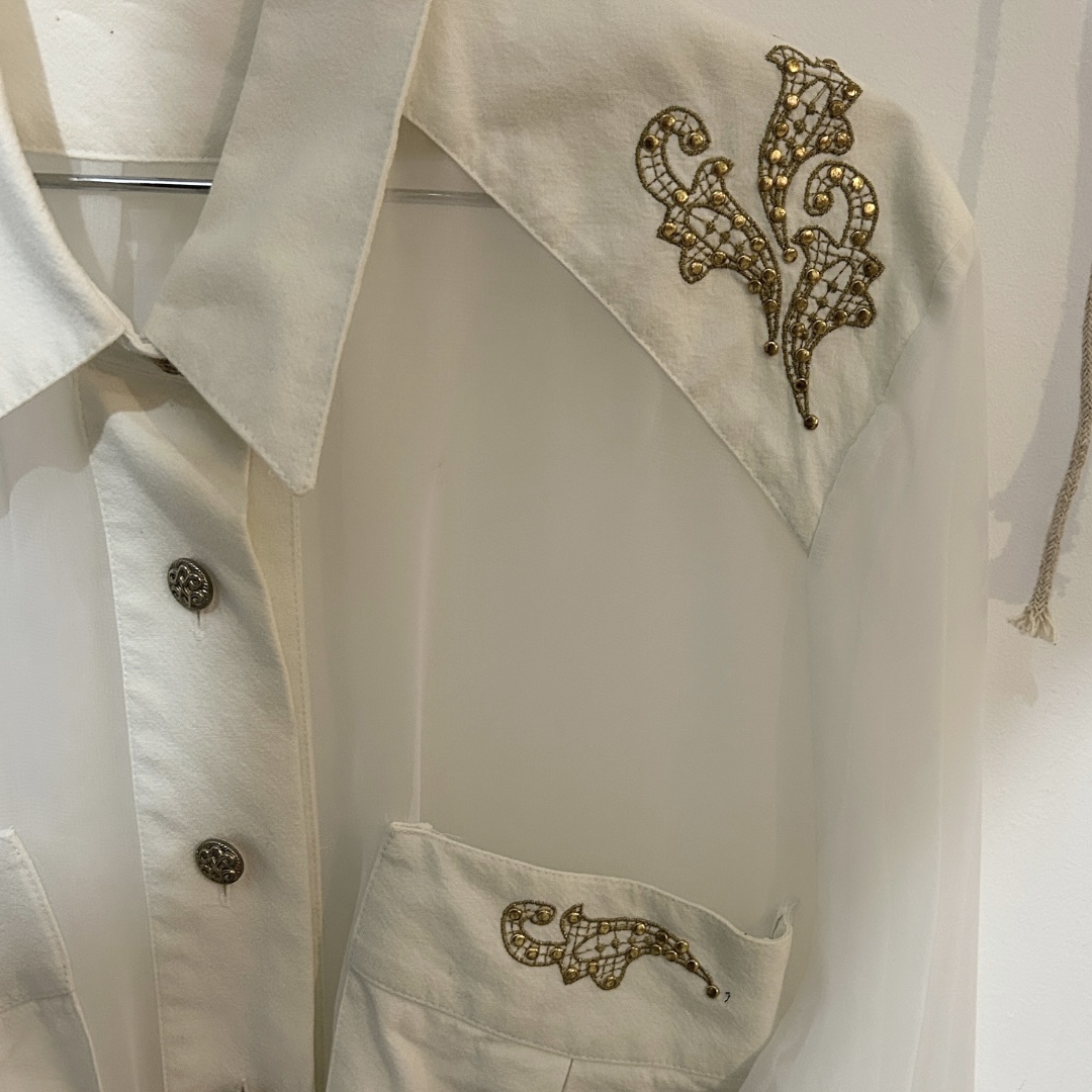 אורך – 79 ס״מ, היקף – 120 ס״מ חולצה מכופתרת שיפון אוברסייז ארוכה בצבע לבן עם כפתורי זהב ועיטורי זהב בכתפיים ובכיסים, חולצה יוקרתית ושיקית בו זמנית עם אפקט רטרו משובח