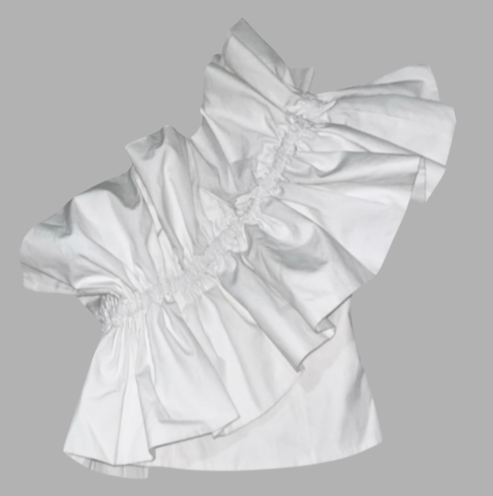 ZARA מידה M חולצת אוף שולדר לבנה חגיגית עם רפל גדול וקפלים אסימטריים, בגזרה מחטבת עם גומי מאחורה בגב. חולצת אוף שולדר דרמטית עם רפל אסימטרי – סגנון רומנטי-מודרני ששובר שגרה. מצב חדש