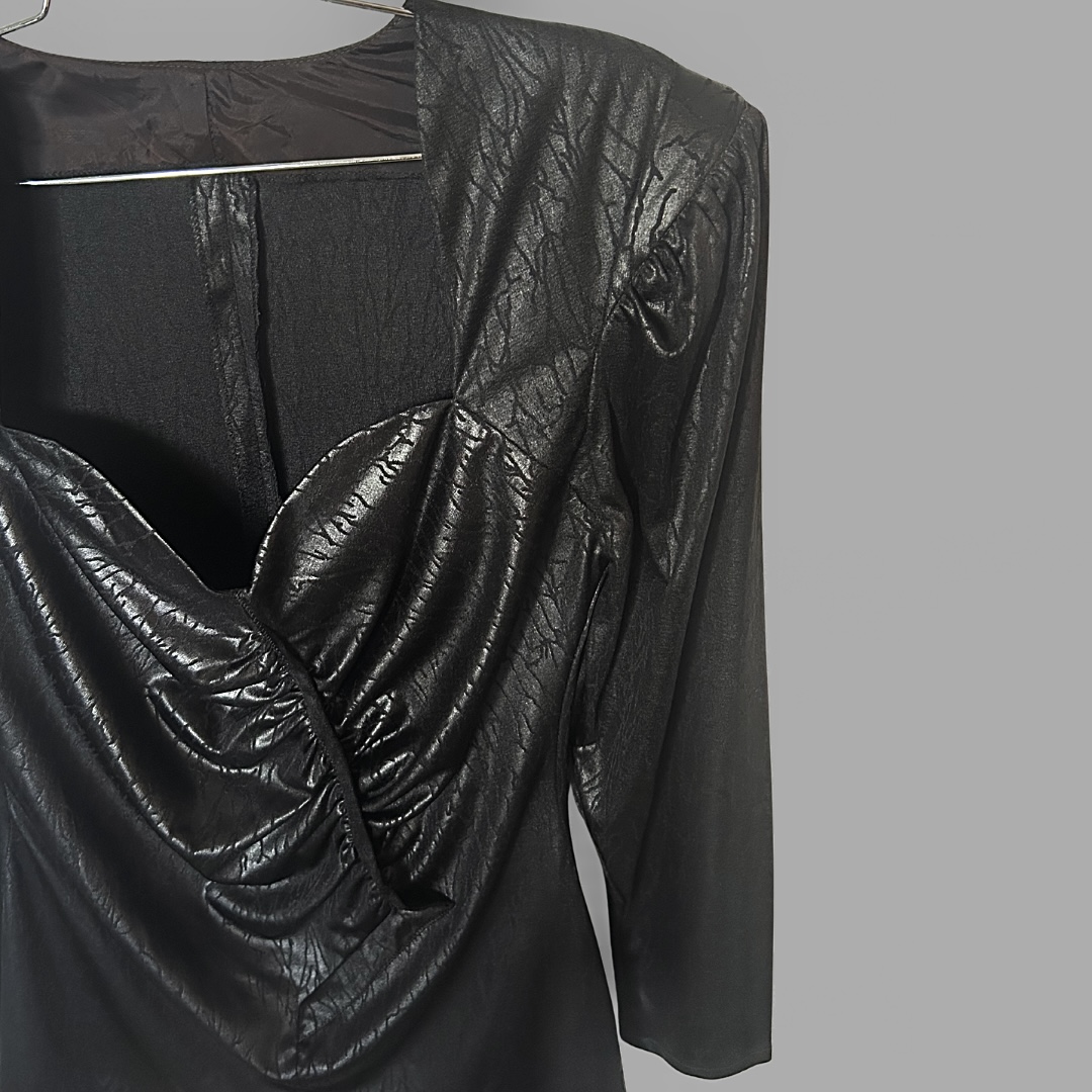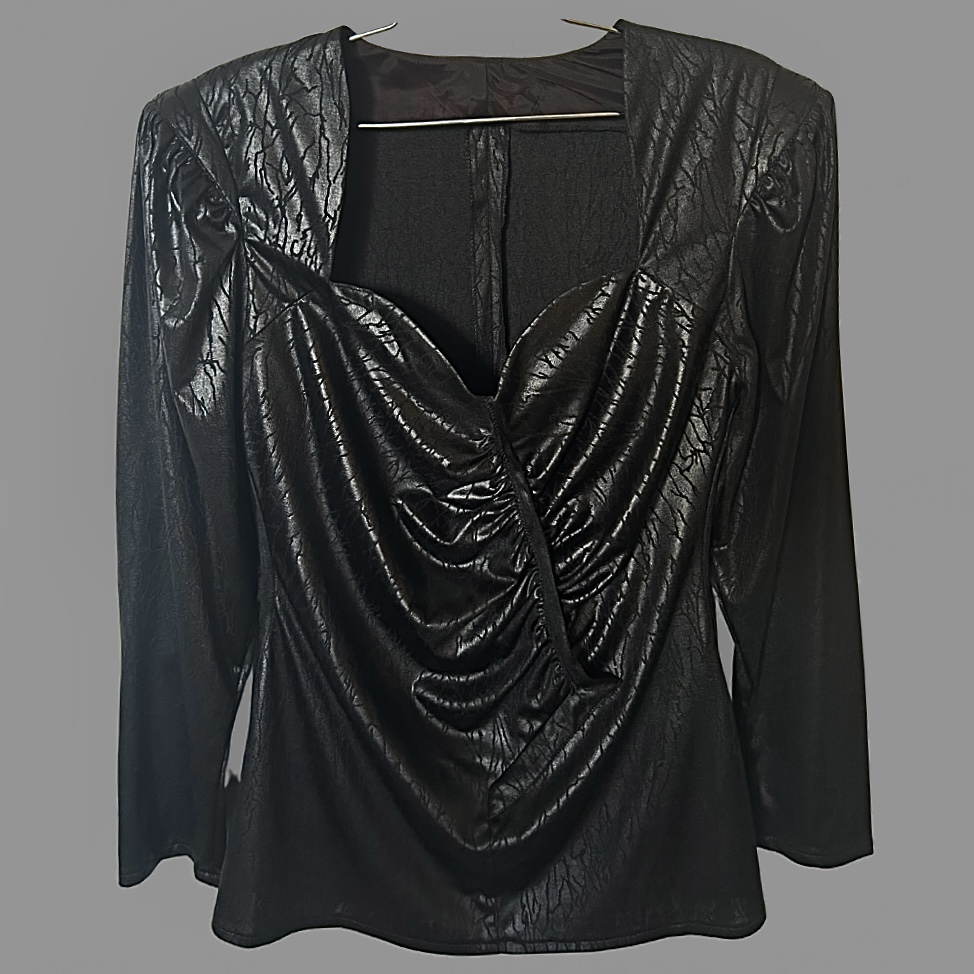 וינטג 80’ חולצת ערב שחורה מידה XL מעט מבריקה בטקסטורה עם כריות כתפיים ומחשוף לב מרובע, מצב חדש