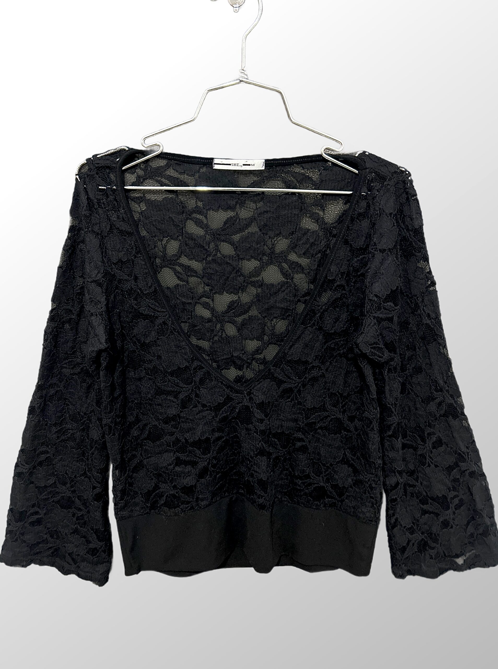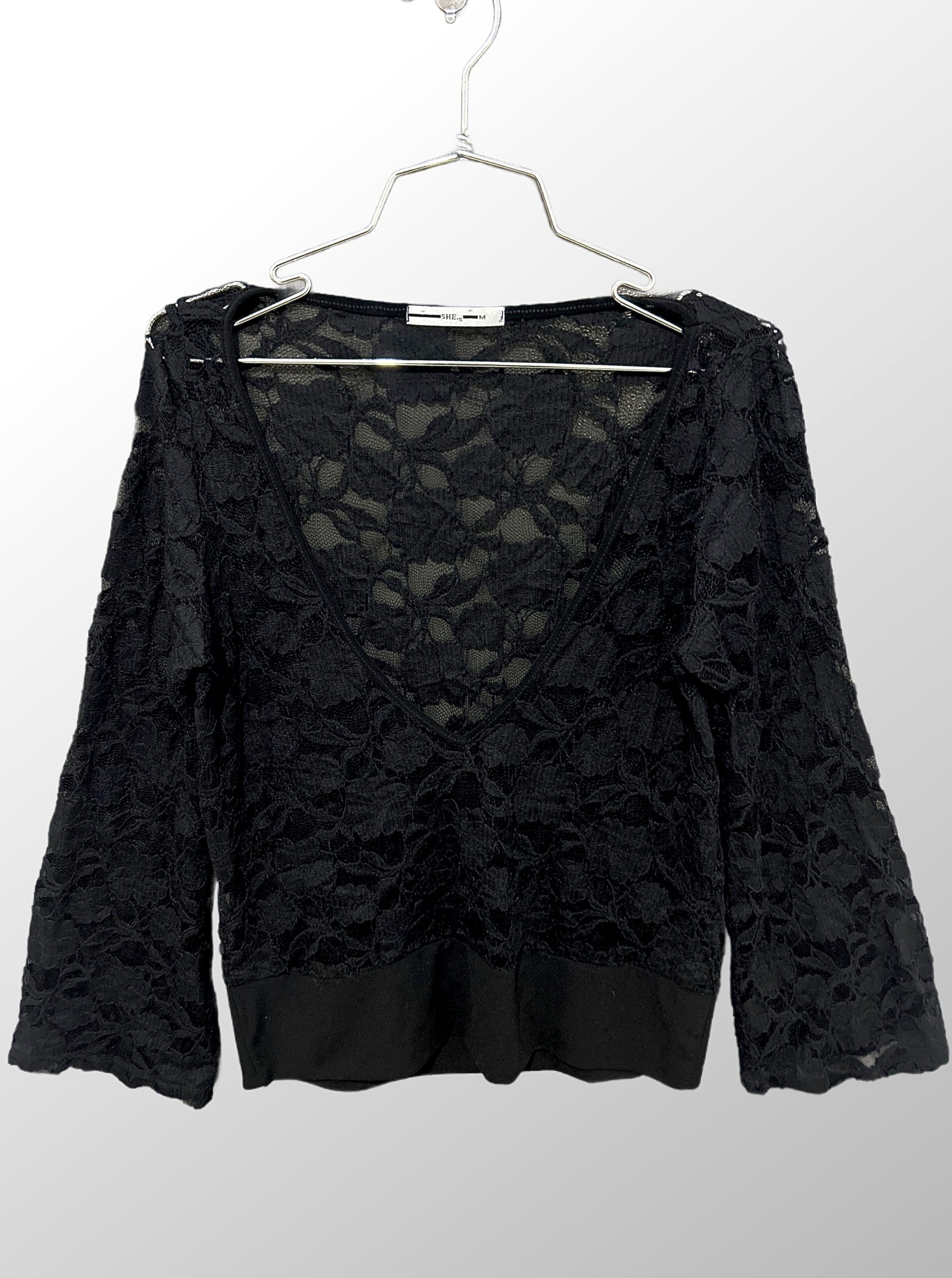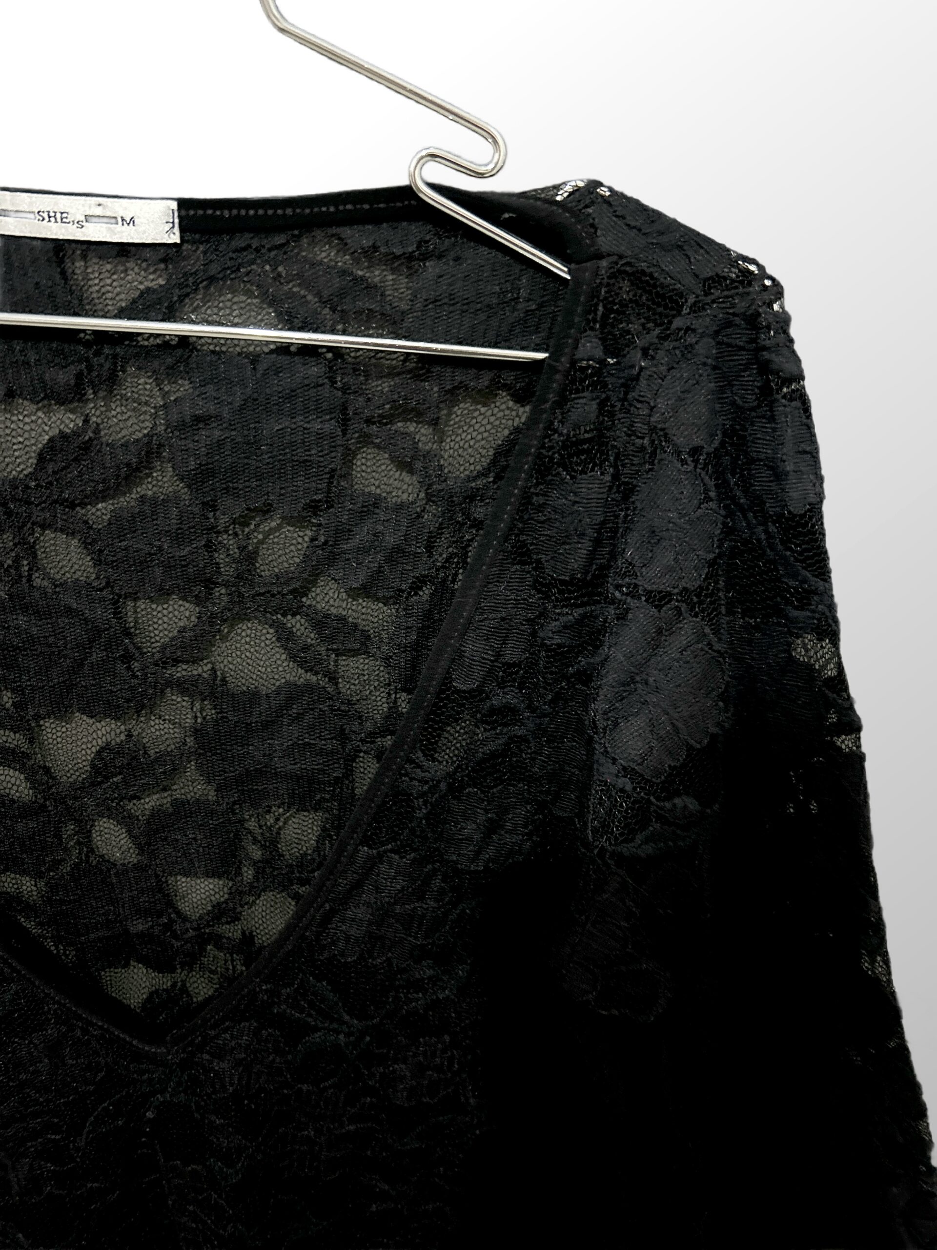 חולצת תחרה לייקרה שחורה עם מחשוף V ומנג’ט בסיומת – נשית, אלגנטית ומלאת סטייל (מידה M, יחידה אחת במלאי!)