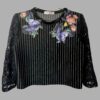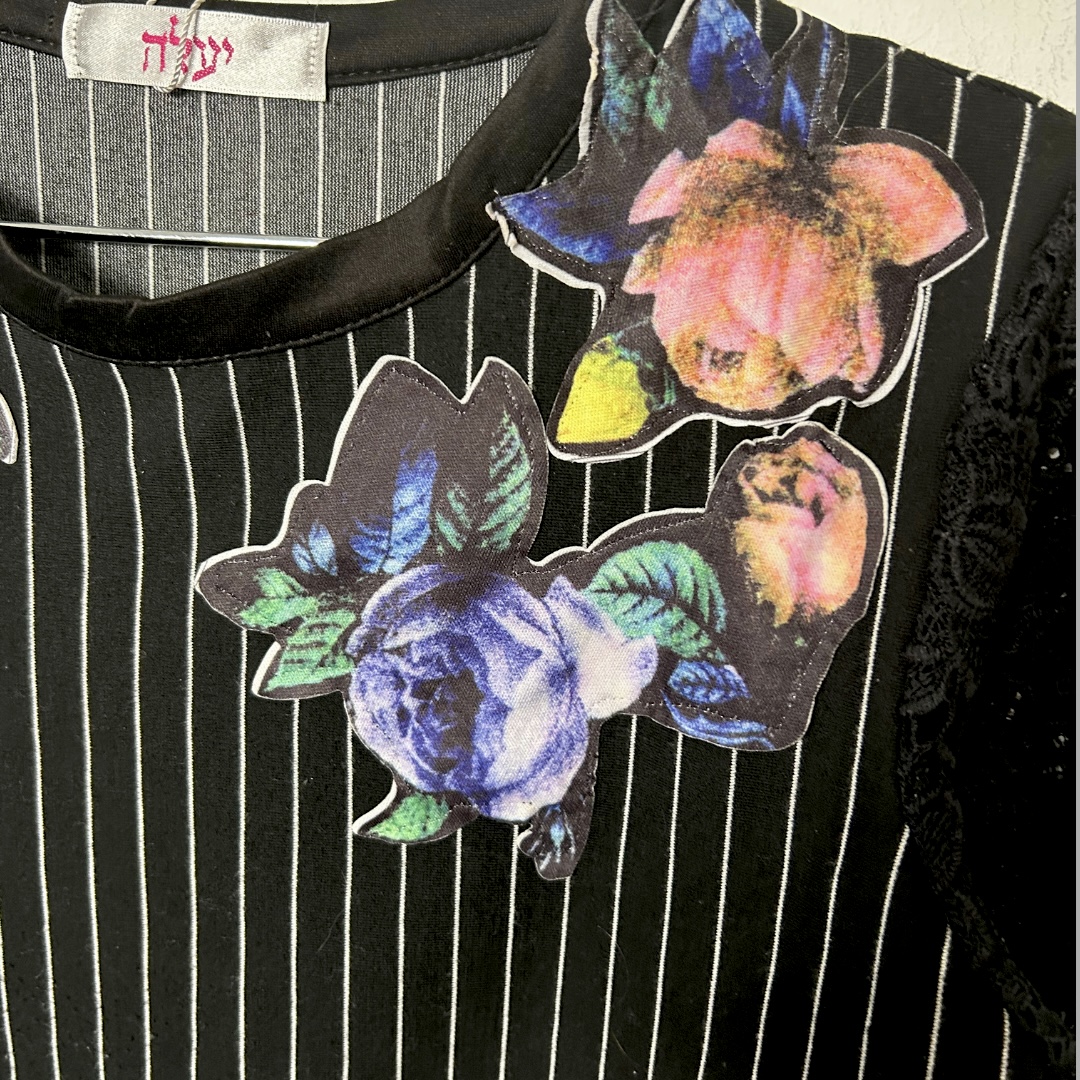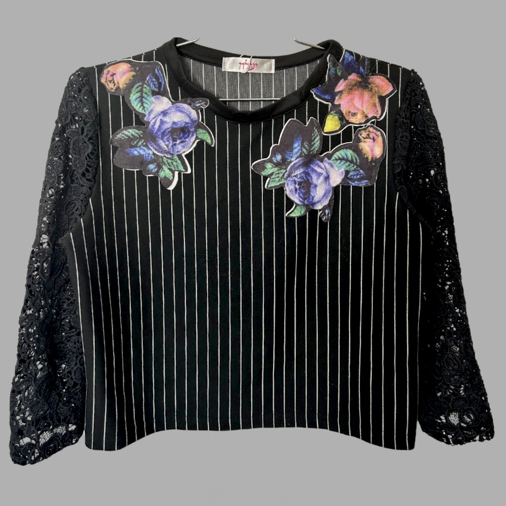 “יעלה״ חולצת קרופ שחורה מידה S פסים עם פאצ׳ים של פרחים ושרוולי תחרה (לייקרה) מצב חדש!