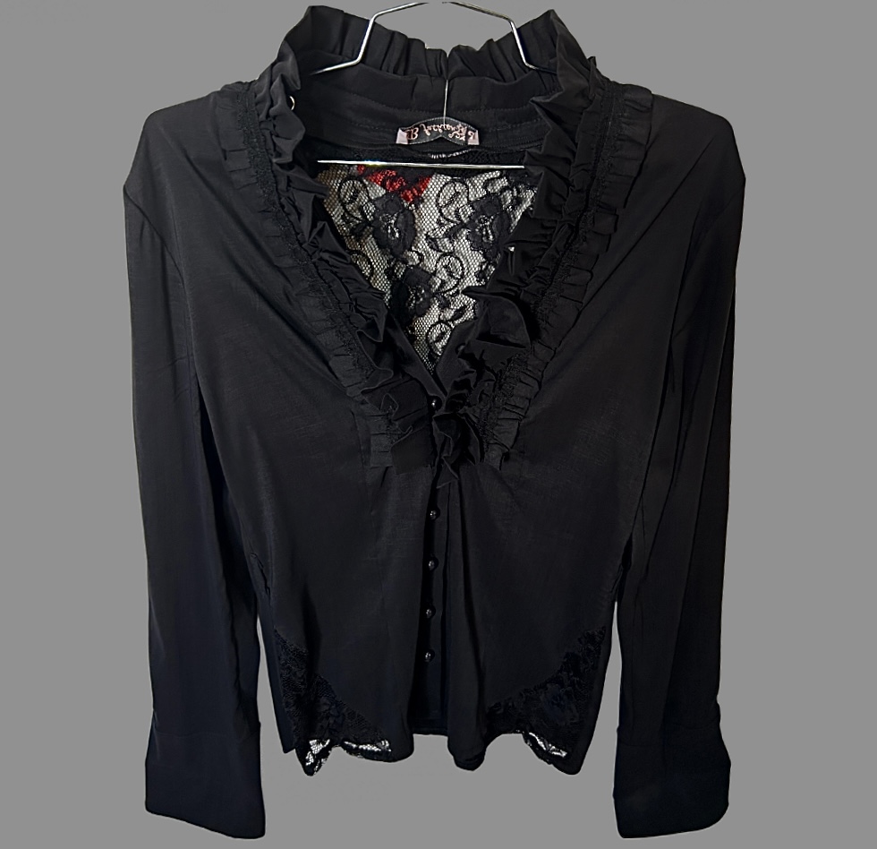 B Fashion עם טיקט! חולצה מכופתרת שחורה מידה S לייקרה אלגנטית וחגיגית עם צווארון אקורדיון ותחרה בגב