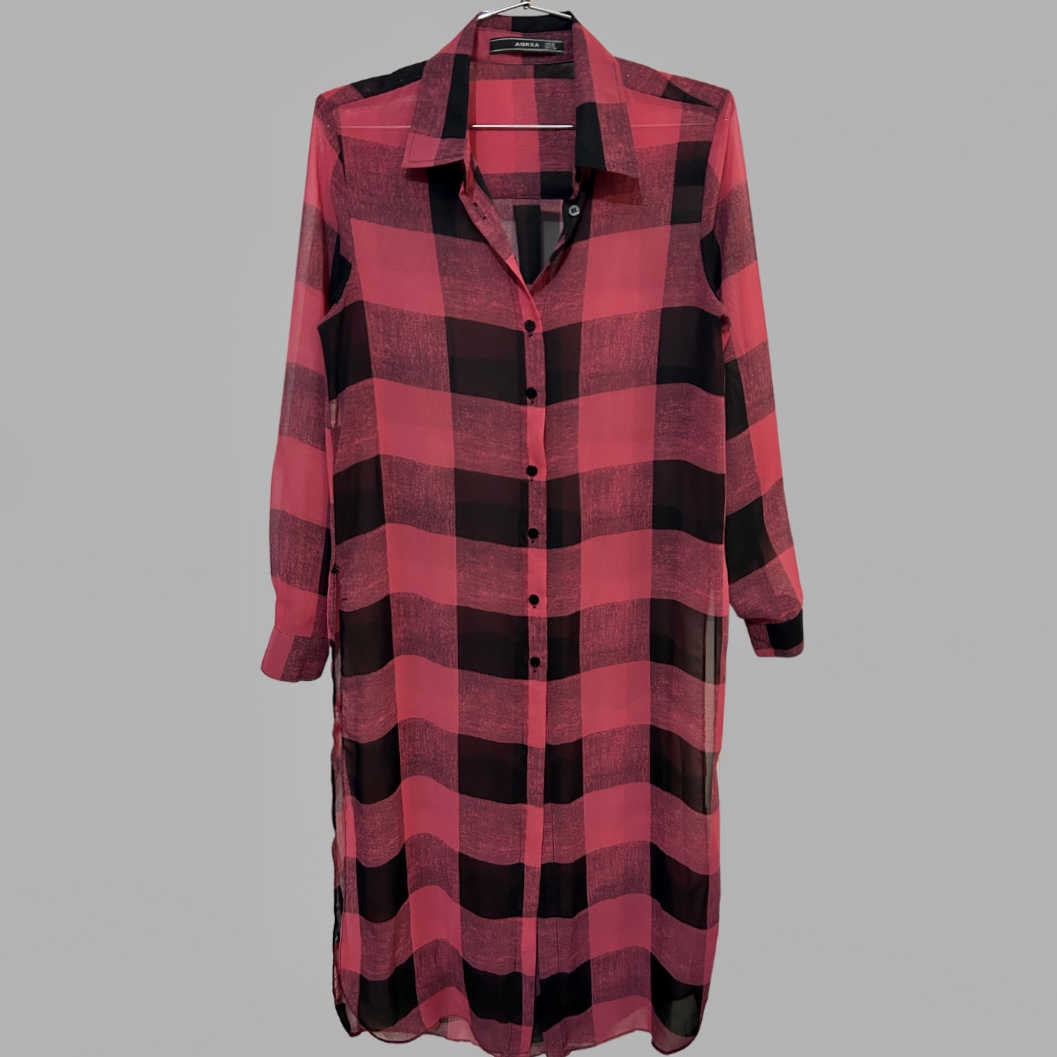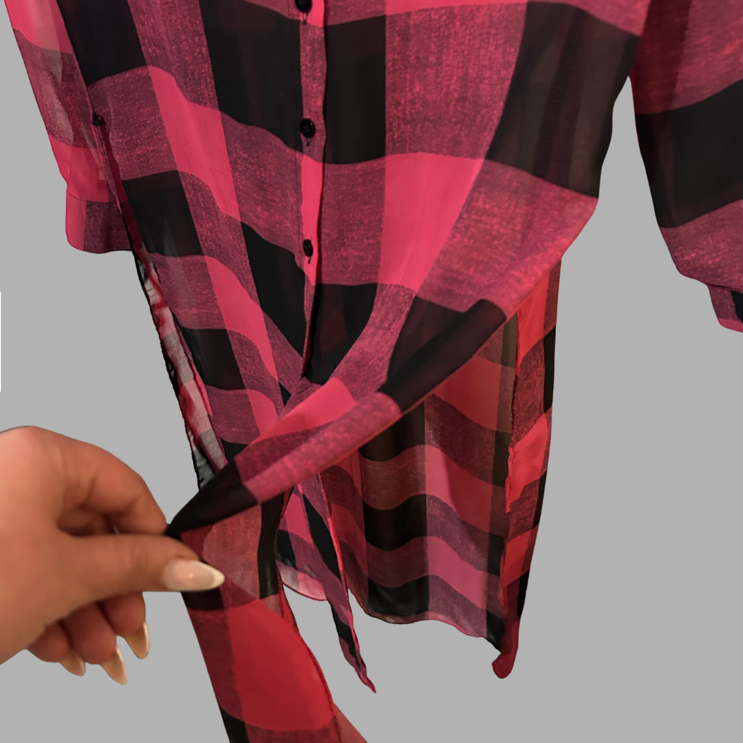 AQRXA חולצת שיפון ארוכה מידה M משובצת בורוד שחור עם פתחים בצדדים. מצב חדש!