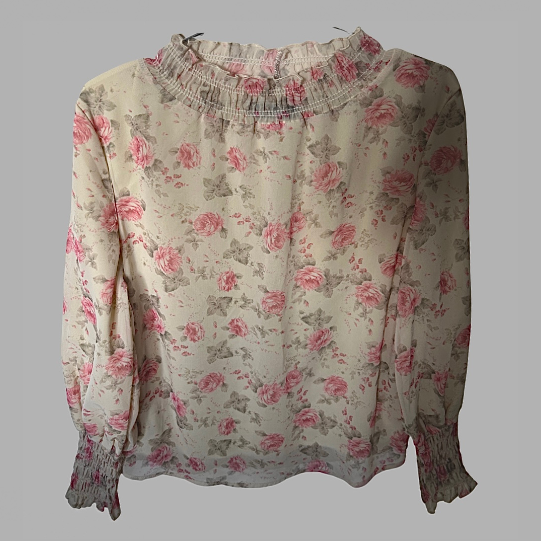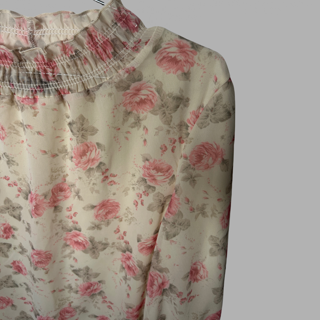 Dominic חולצת שיפון אלגנטית נשפכת פרחונית מידה S בצבע קרם עם ורדים בורוד פסטל, כיווצים בסיומת השרוולים ובצווארון. עם תחתית, מצב חדש
