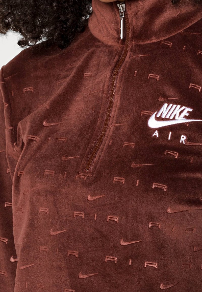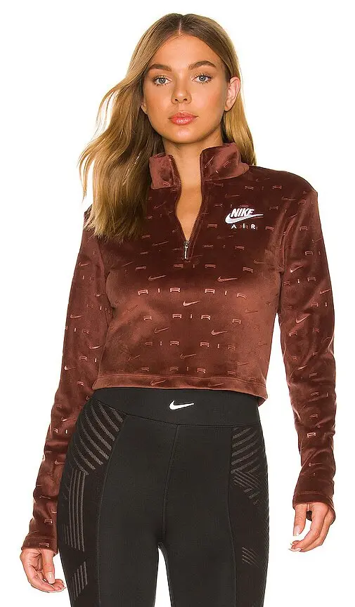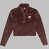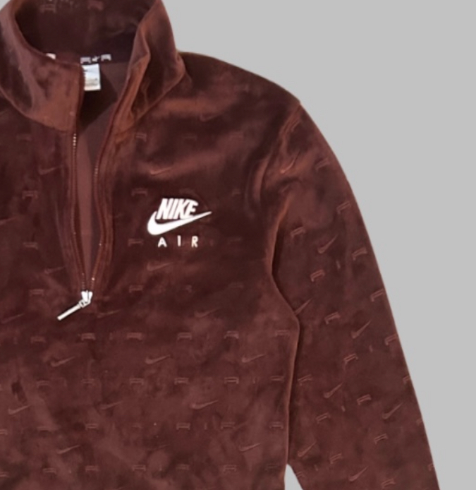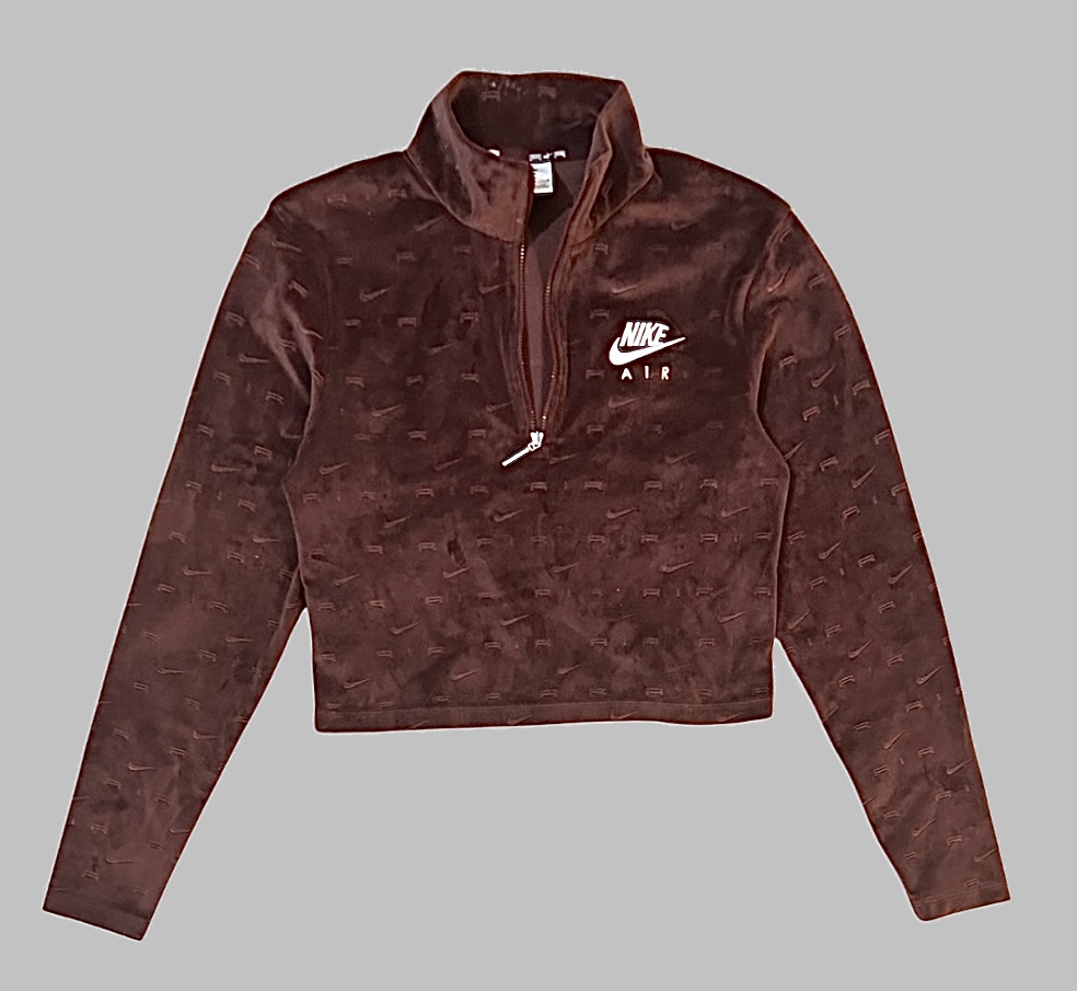 Nike חולצת קרופ קטיפה לייקרה חום חמרה מידה M עם חצי רוכסן עם הטבעות לוגו על כל החולצה ולוגו רקום לבן