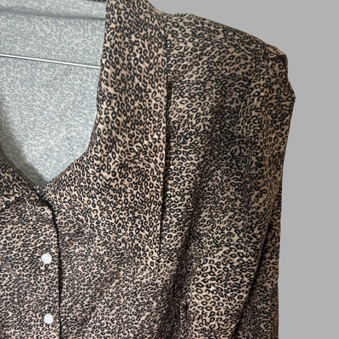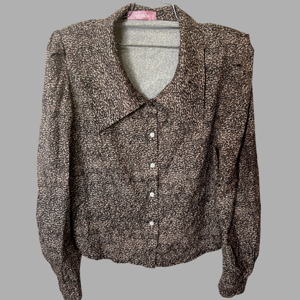 Toppatsu חולצה מנומרת מכופתרת בסגנון רטרו בד נשפך עם צווארון גדול ושפיצי מחשוף וי כריות כתפיים ושרוולים נשפכים, מצב חדש!