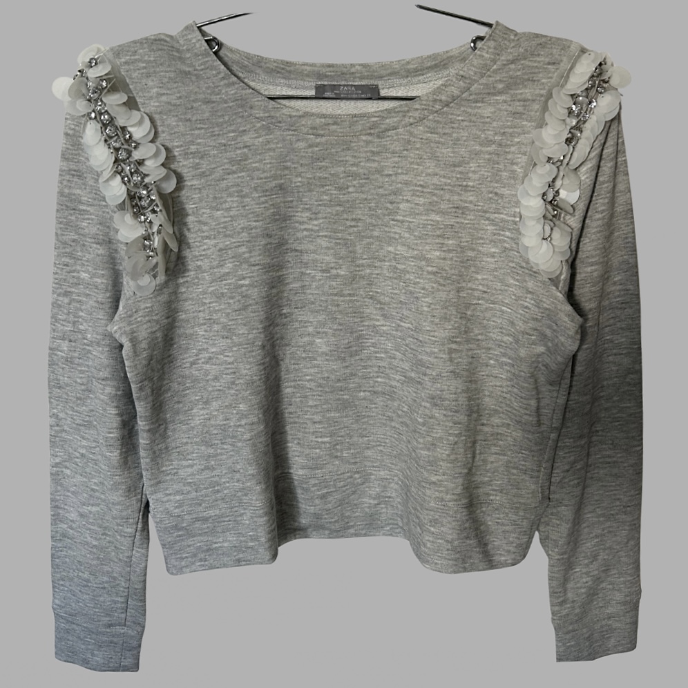 ZARA סווטשירט קצרצר אפור מידה S בעיטור אופנים ופאייטים בכתפיים