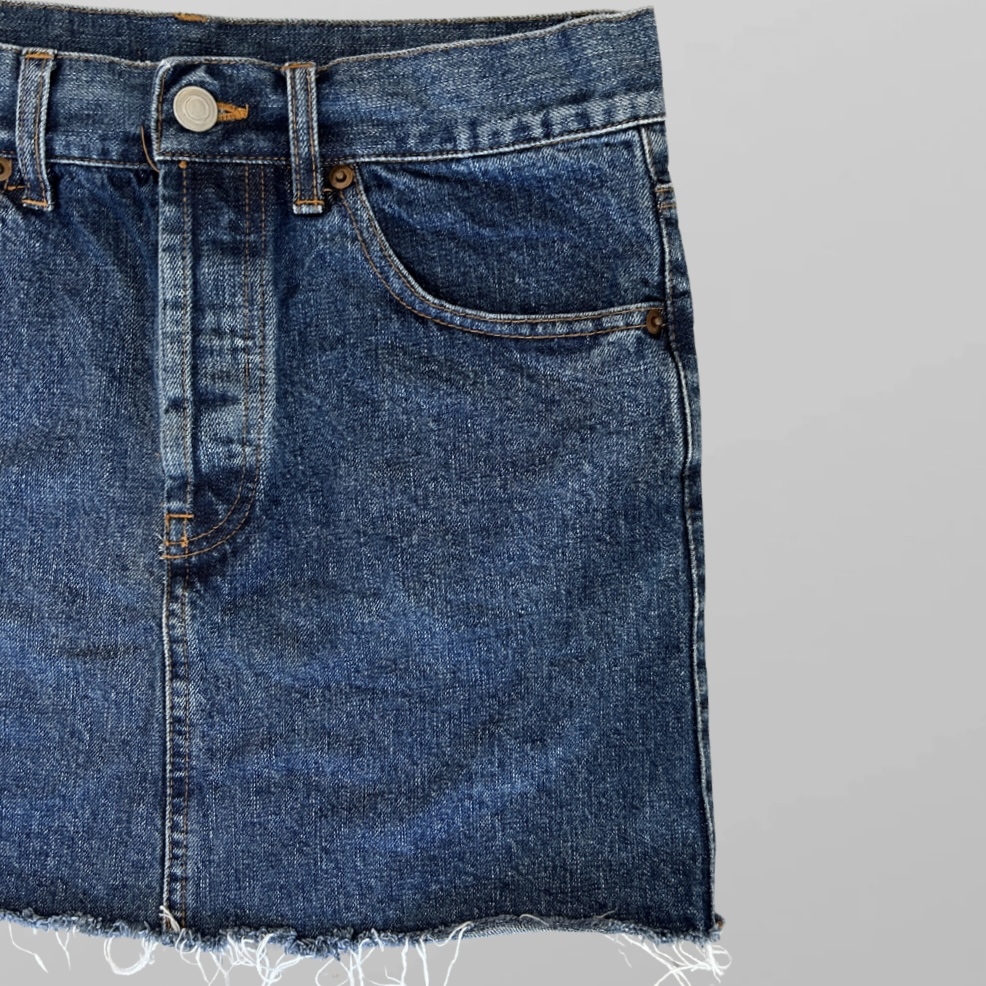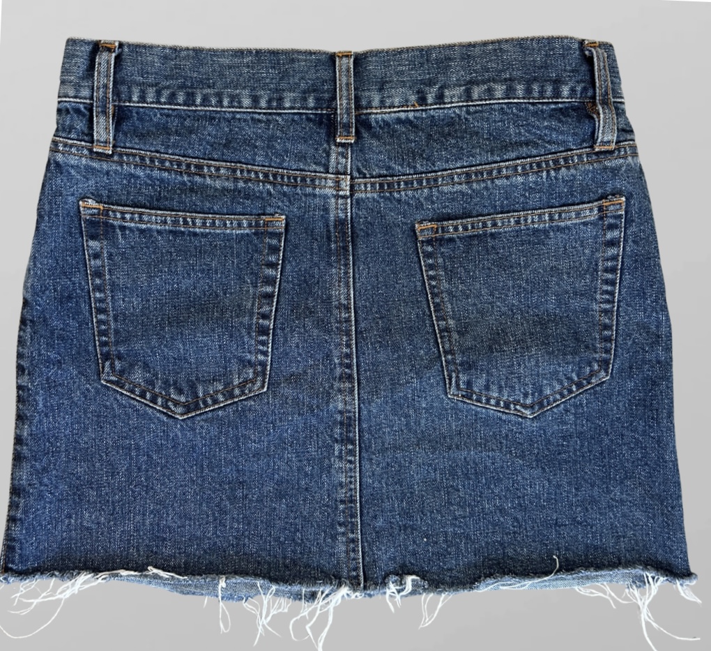 היקף מותן – 80 ס״מ, אורך 36 ס״מ חצאית ג׳ינס של ברנדי מלוויל בצבע כחול קלאסי עם סיומת פרומה. חצאית ג׳ינס קלאסית באורך מיני רשום מידה 40 אך תתאים למידה 38 או מידה M