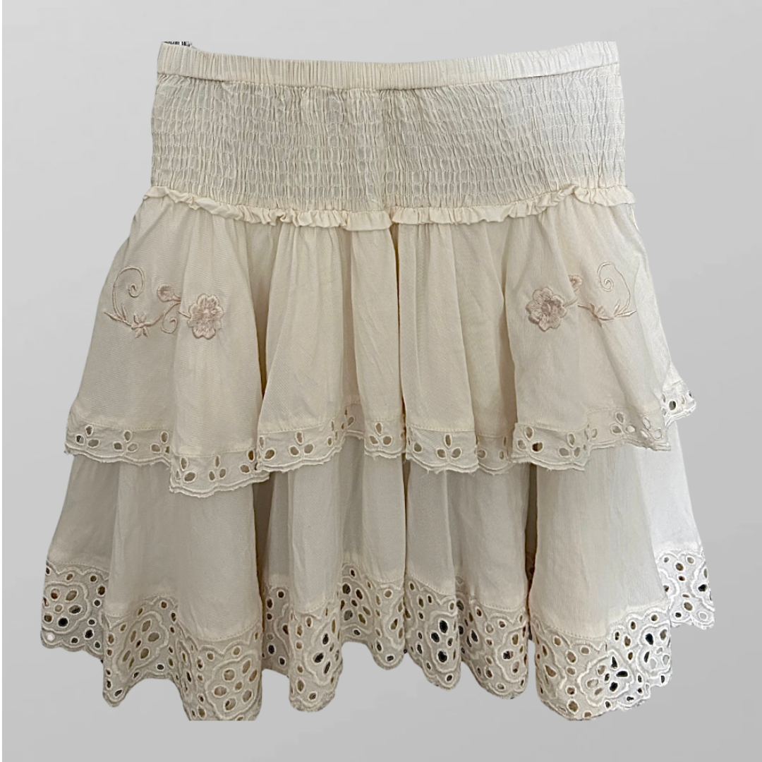 חצאית קומות עם גומי כיווצים בחלק העליות, גזרת פעמון מחמיאה, עם רקמות פרחים, חצאית בסגנון בוהו שיק רומנטית בשילוב קרושה בסיומת, סיומת גלים מיוחדת ורקומה, חצאית איכותית ומיוחדת
