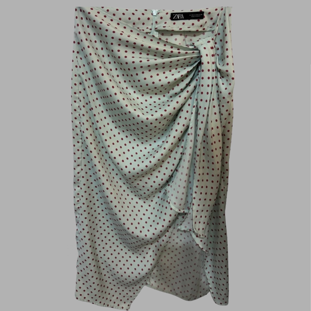 ZARA מידה M חצאית כיווצים א-סימטרית עם שסע בצד בצבע מנטה עם נקודות בורדו