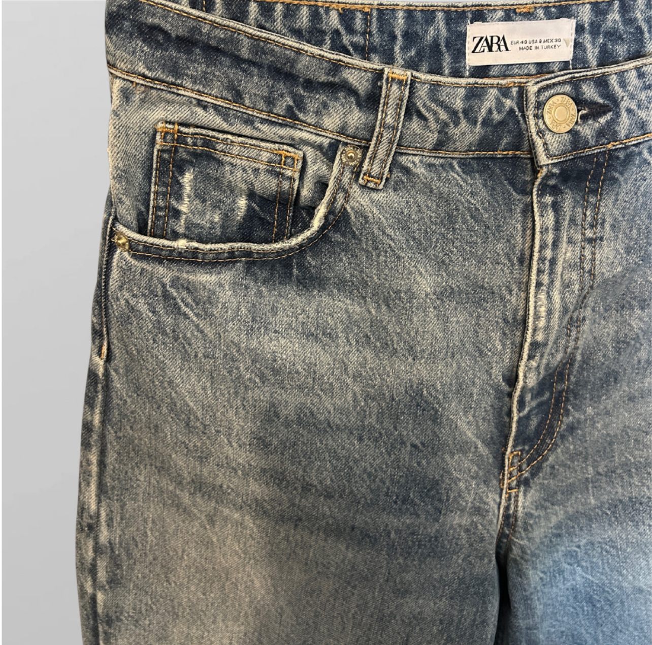 היקף מותן – 85 ס״מ , אורך – 106 ג׳ינס גזרה גבוהה של זארה בגזרה ישרה ורחבה מידה L צבע כחול קלאסי