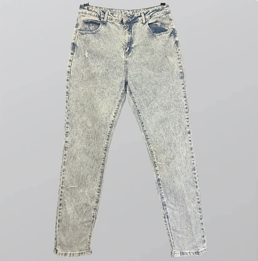 היקף מותן(לייקרה) – 92-97 ס״מ , אורך – 114 ס״מ ג׳ינס עם פתחים קטנים בקרסול הפנימי מעט לייקרה בצבע בהיר עם שטיפה מיוחדת ומגניבה, גזרה גבוהה ומחמיאה מידה 44 של קסטרו