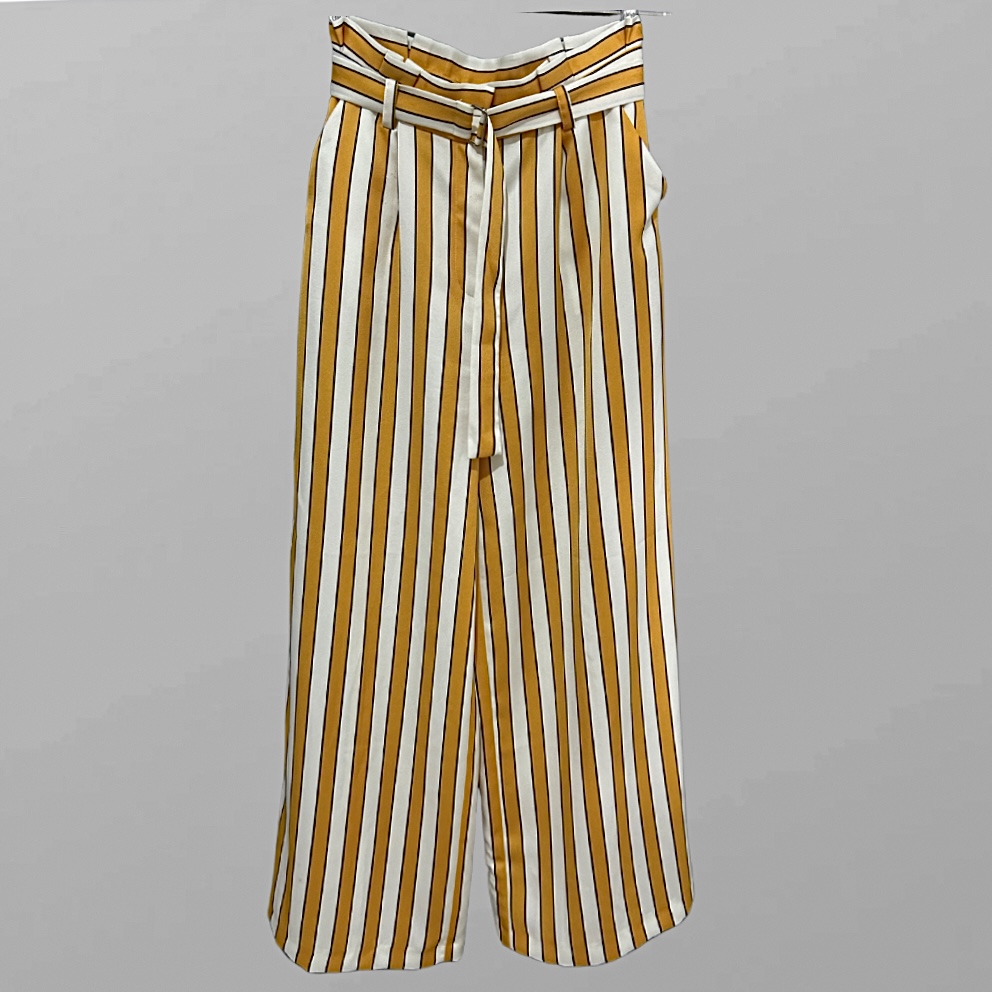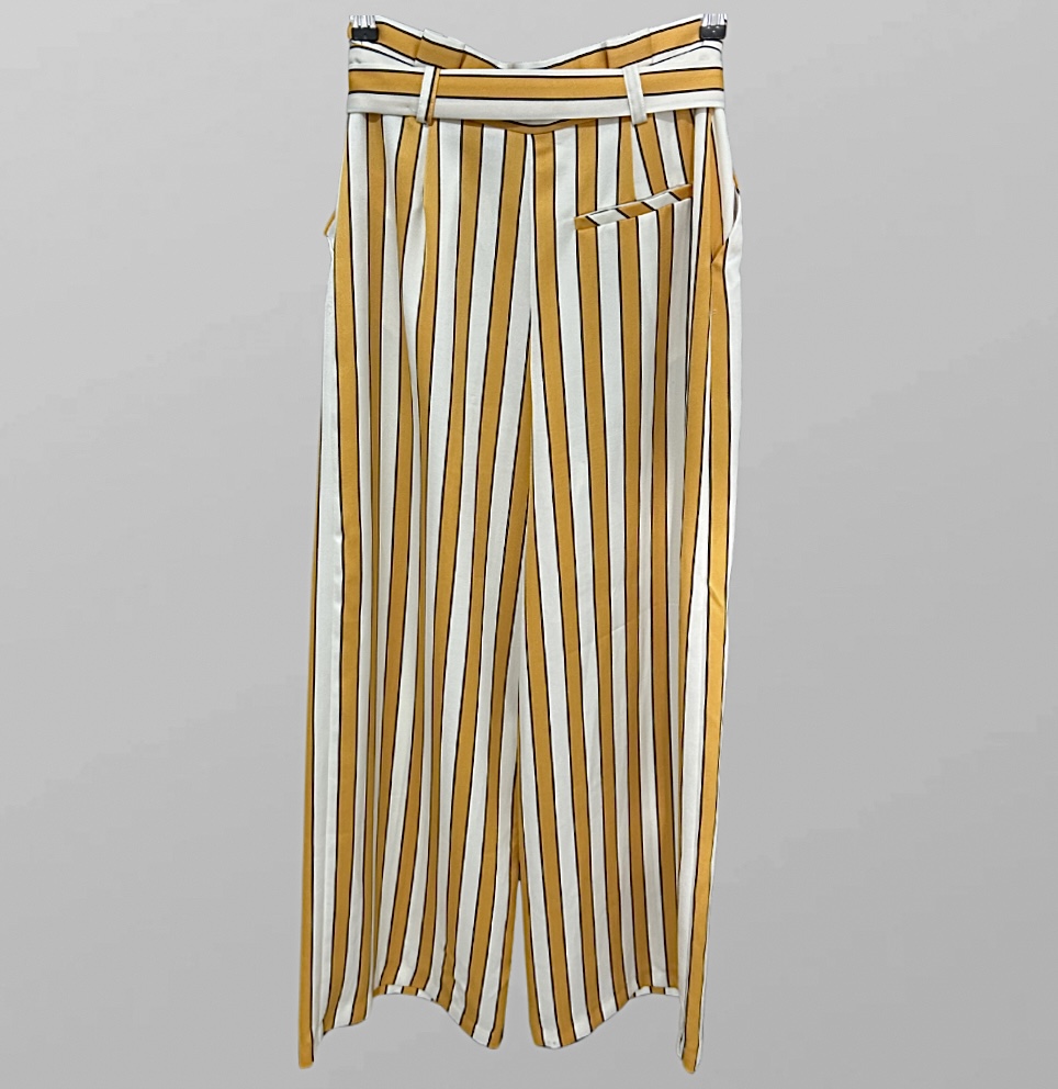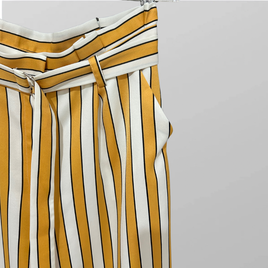 מכנסיים אלגנטיים נשפכים ורחבים בהדפס פסים צהובים! גזרה גבוה ושילוב חגורה מידה M