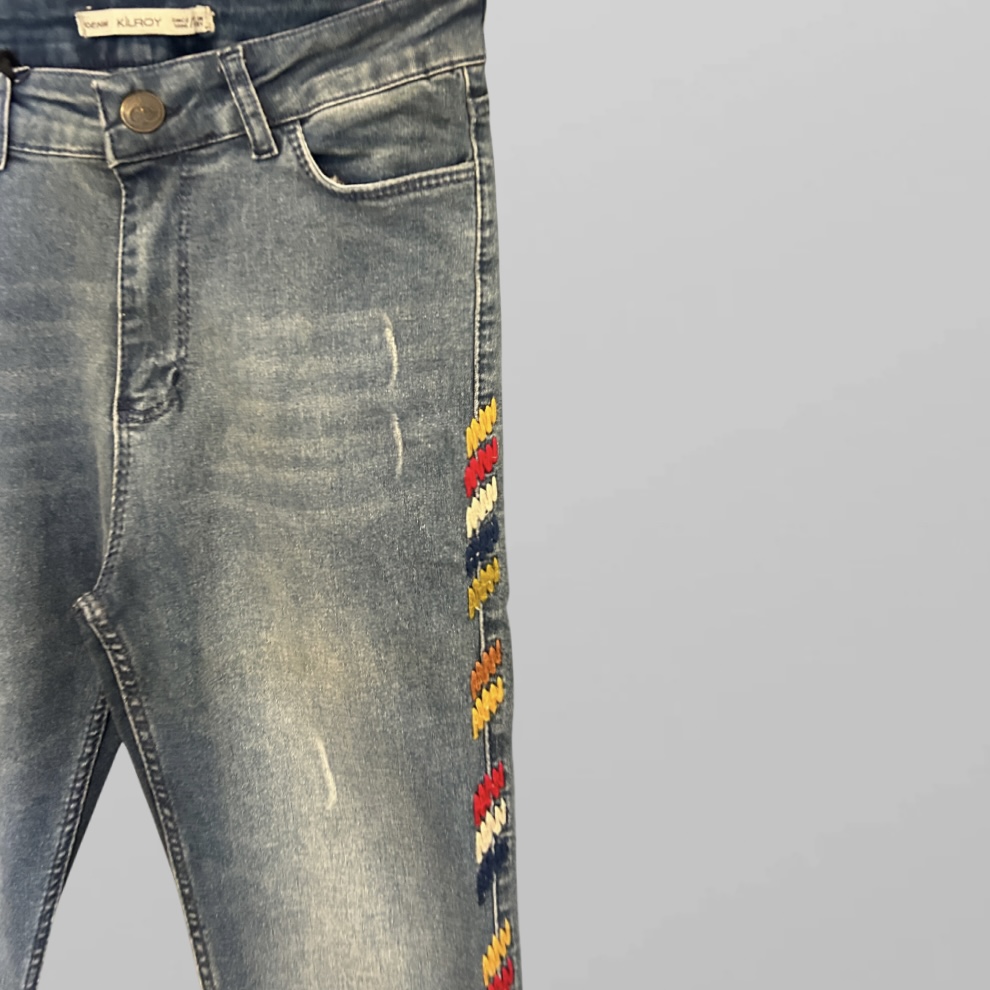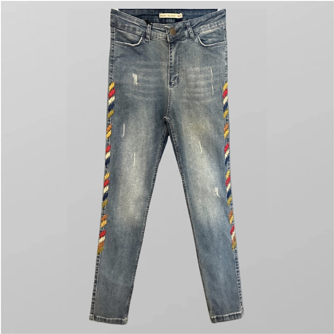 היקף מותן (לייקרה) – 68-80 ס״מ ג׳ינס עם רקמה צבעונית בגזרה גבוהה לייקרה גזרת סקיני מידה M