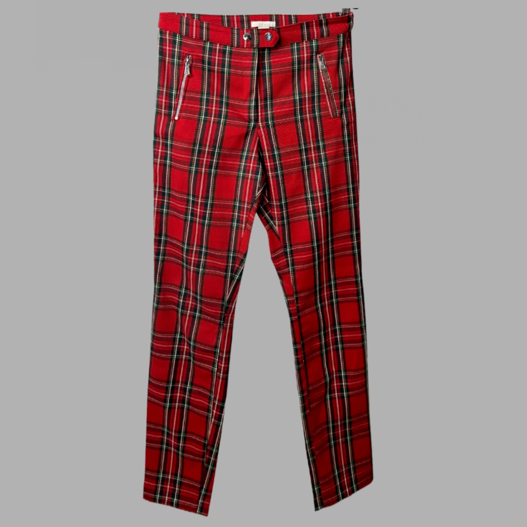 Hm מידה 38 מכנסיים אדומים משובצים גזרה גבוהה בדוגמת טרטן עם רוכסנים גזרה צמודה ללא לייקרה, חדשים