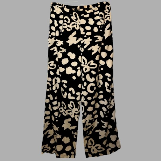 מכנסי סאטן מודפסים, מכנסיים נשפכים, מכנסיים גזרה ישרה, מכנסיים לנשים, מכנסיים שחור לבן, מכנסיים אלגנטיים, פריימרק, קולקציית חג, בגדי ערב