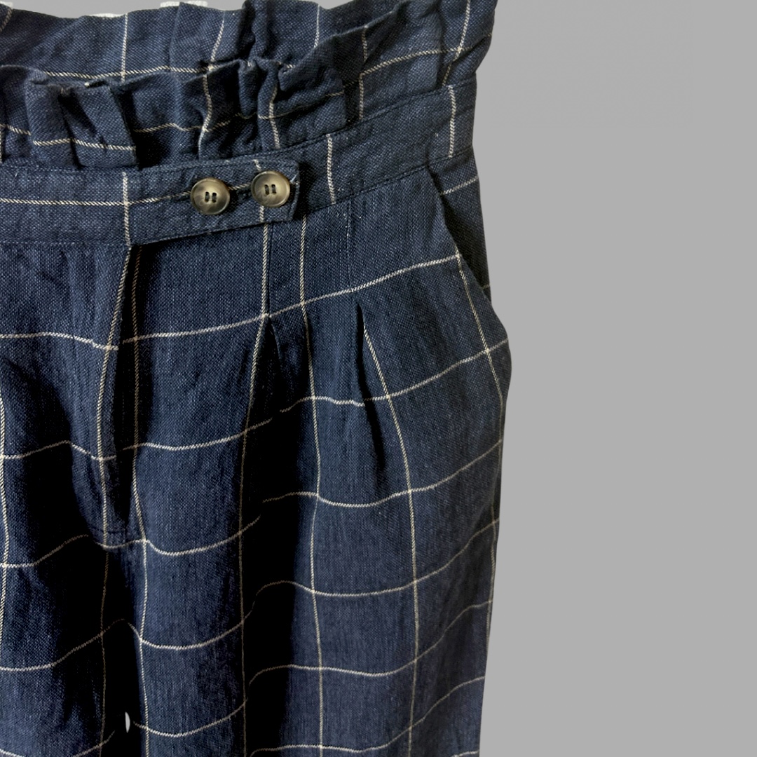 מדובר ב־מכנסיים מחויטים כחולים בגזרה גבוהה, שמחמיאים לגוף ומדגישים את קו המותן בצורה אלגנטית וקלילה. בחלק העליון עיטור ריפל עדין סביב החגורה מוסיף מגע רך ונשי, כזה שהופך את המכנסיים לפריט שיש בו גם מבנה וגם רכות.