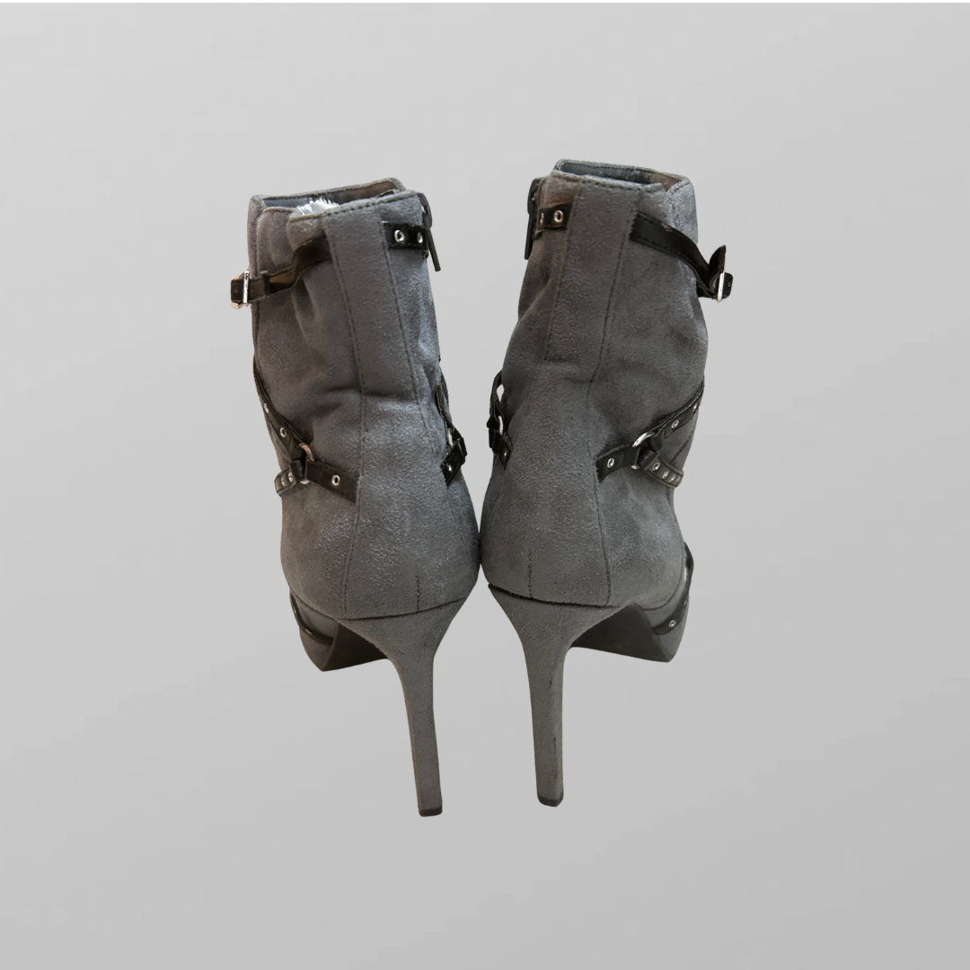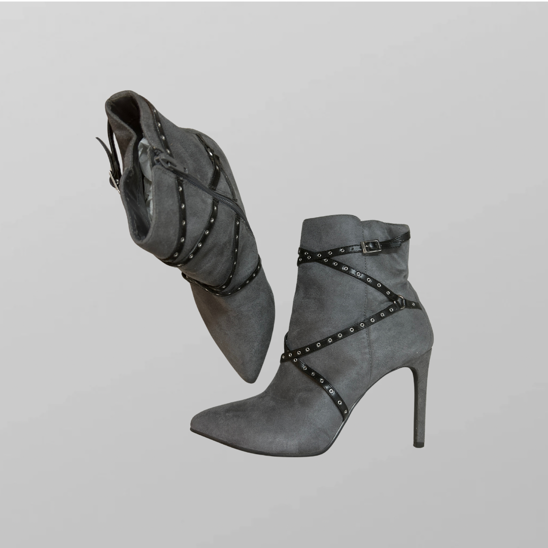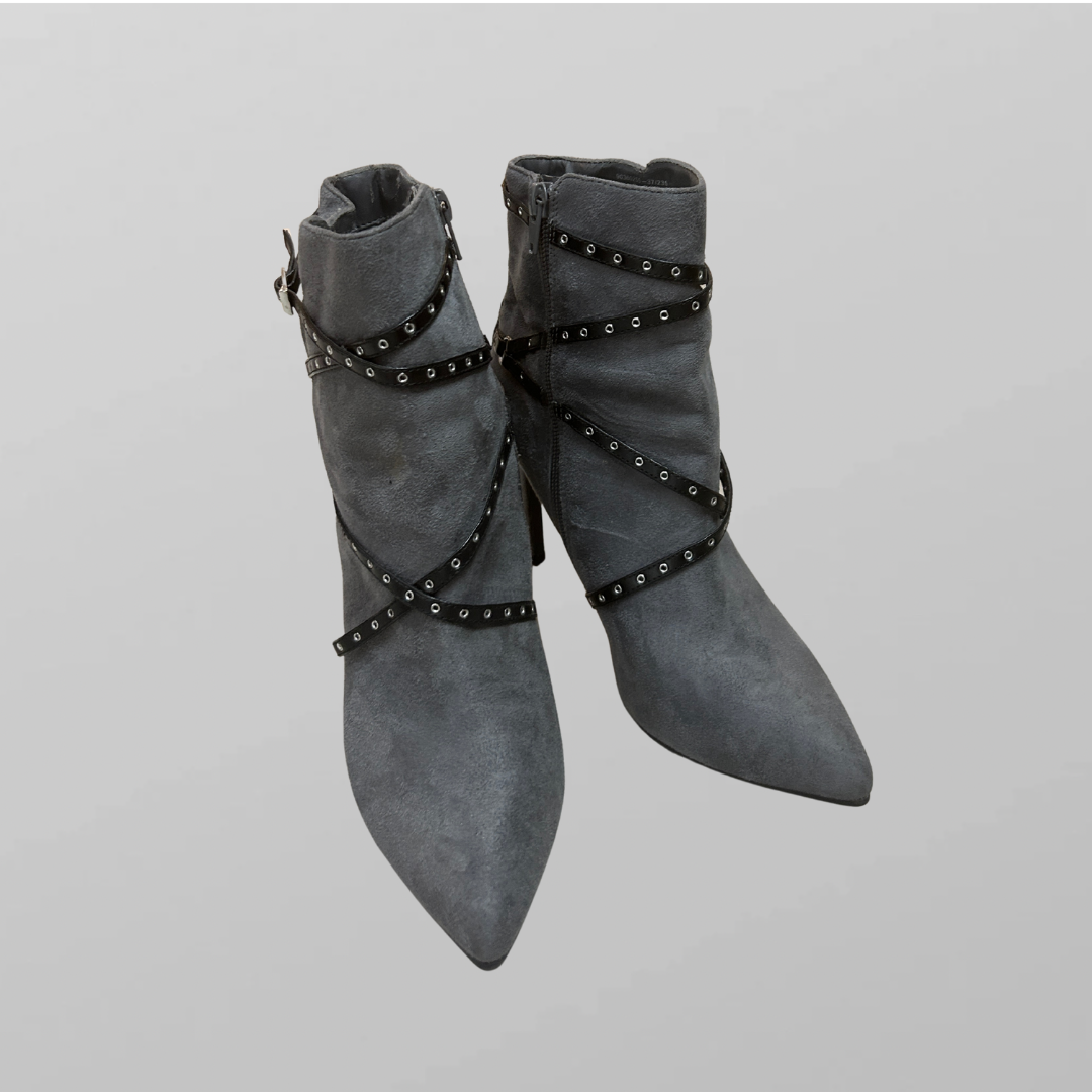 מגפו עקב דמוי זמש  בגוון אפור עם רצועות דמוי עור עם ניטים קטנים ועדינים  מבית Charlie & Keith, מידה 37, הם הפיס המושלם לשדרוג כל לוק – מהיומיומי ועד ערב עם נגיעה בוהמיינית שיקית. העיצוב המיוחד כולל קצה שפיץ מחודד, עקב בגובה אידיאלי לנוחות והליכה יציבה, וגימור יוקרתי בעבודת יד. מדובר בפריט חדש לגמרי, שלא ננעל, כך שתוכלי ליהנות ממנו במצב מושלם.