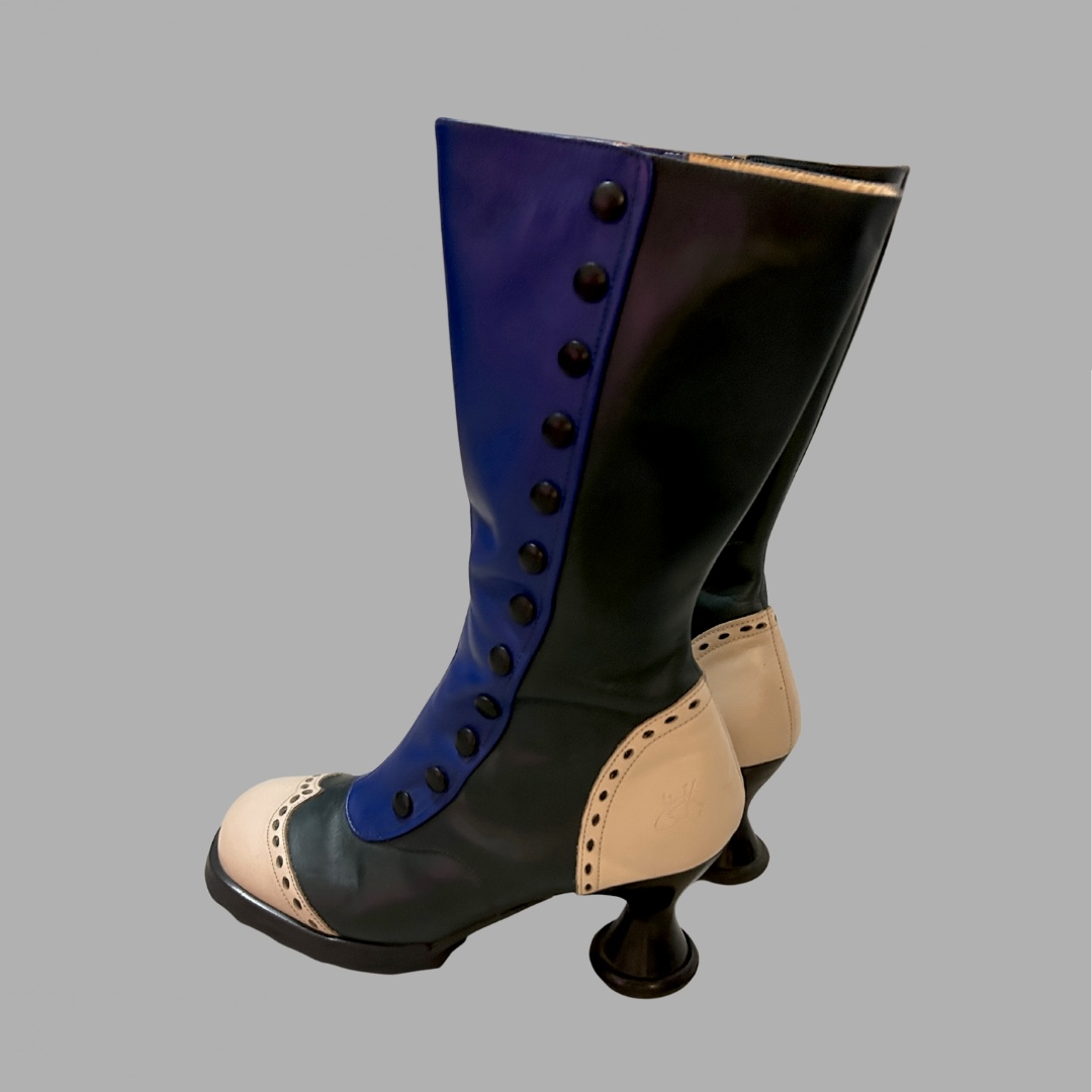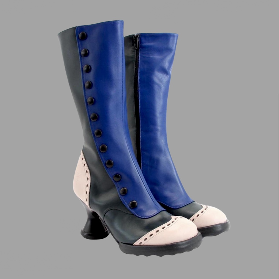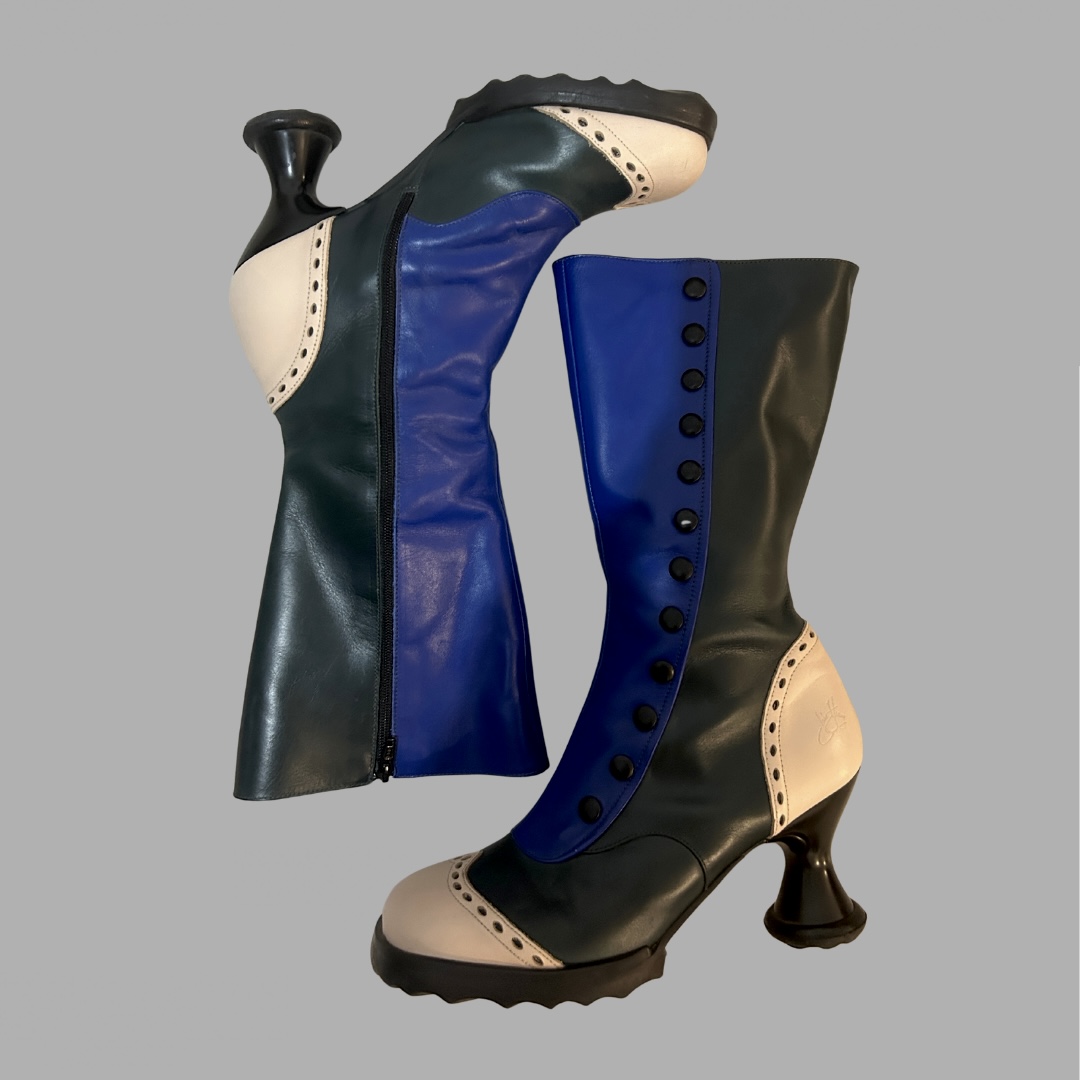 מגפיים ייחודיים ונדירים בגזרת ויקטוריאן מודרנית, בגווני כחול רויאל, ירוק-אפור ושמנת, בעיצוב אמנותי שמדגיש אלגנטיות נצחית ונוכחות דרמטית. כל פרט במגף הזה – מהכפתורים השחורים שמטפסים במעלה הרגל ועד העקב המעוגל בעבודת יד – מספר סיפור של אופנה, אומץ וסטייל אמיתי. זהו פריט לאספניות של נעליים עם טעם, כאלו שמעריכות איכות, דיוק ועיצוב עם נשמה.