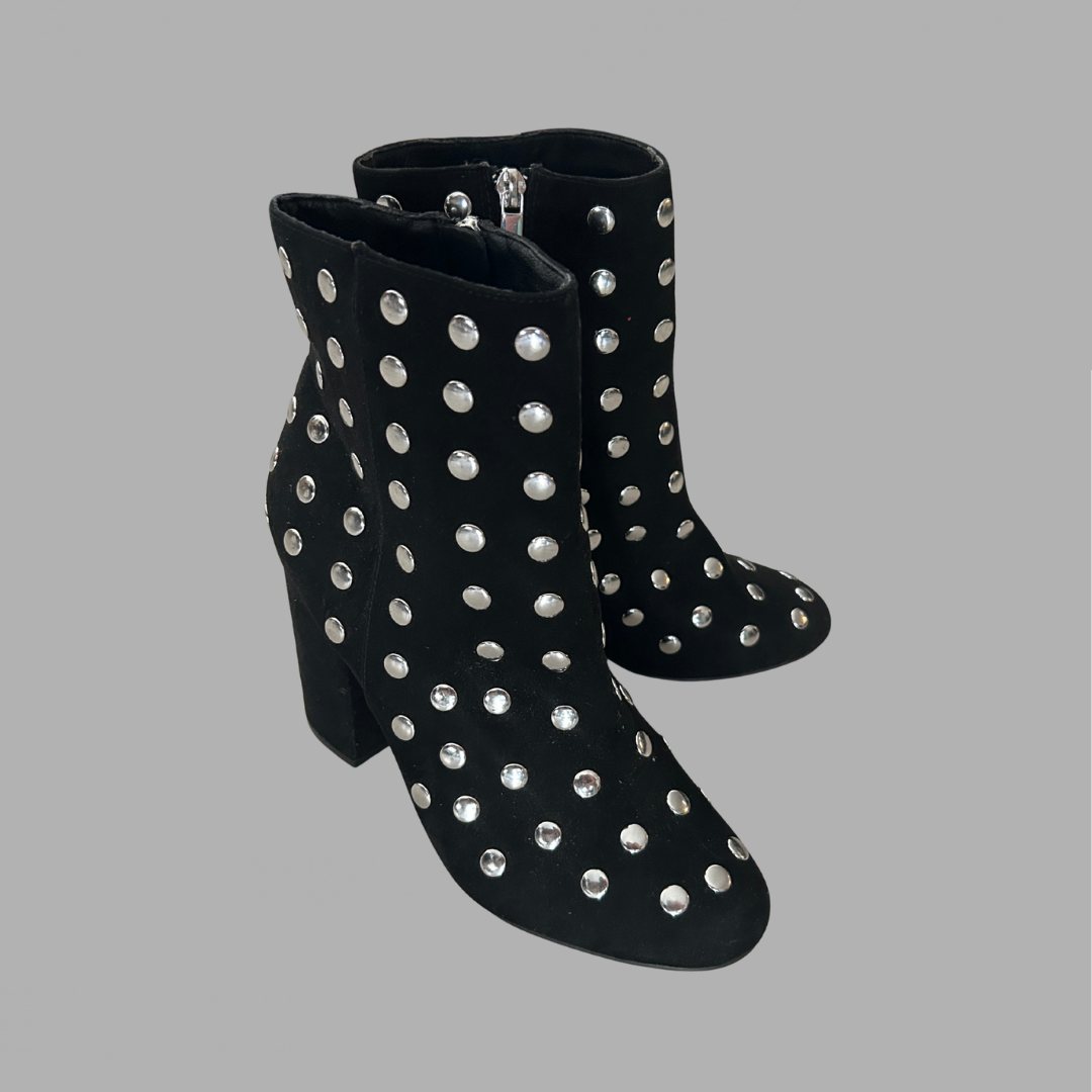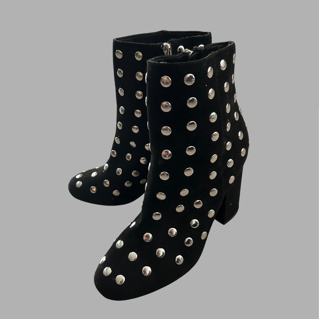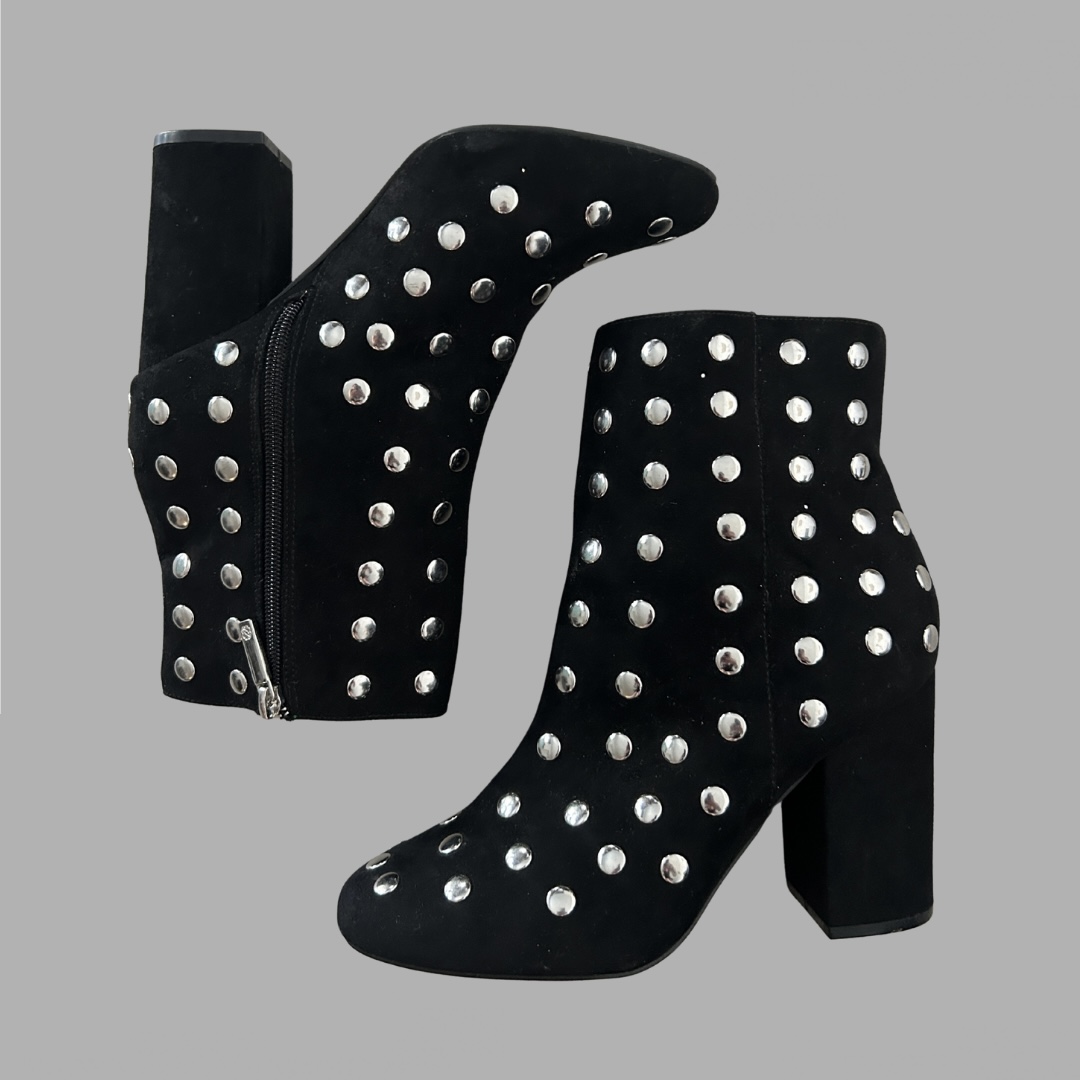 מידה 39ה חדש! שדרגו את סגנון האופנה שלכם עם מגפי הקרסול האופנתיים האלה של מורגן דה טוי. המגפיים בעלי צורת אצבע עגולה וגובה עקב בינוני, המספקים נוחות וסגנון כאחד. החלק העליון של העור השחור מעוטר בניטים כסופים שיקיים, המוסיפים נגיעה של זוהר לכל תלבושת.