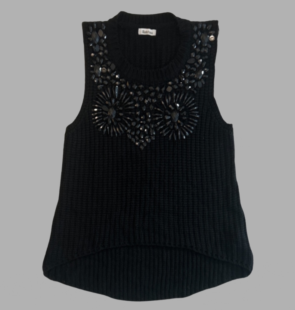 אפודה מהודרת וחגית בגזרה קצת מתרחבת, ארוכה יותר מאחורה וקצרה מקדימה! בצבע שחור בשילוב חרוזים שחורים.