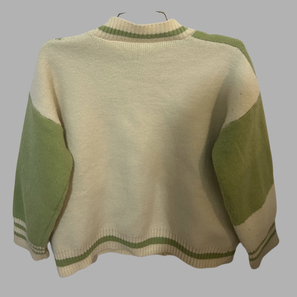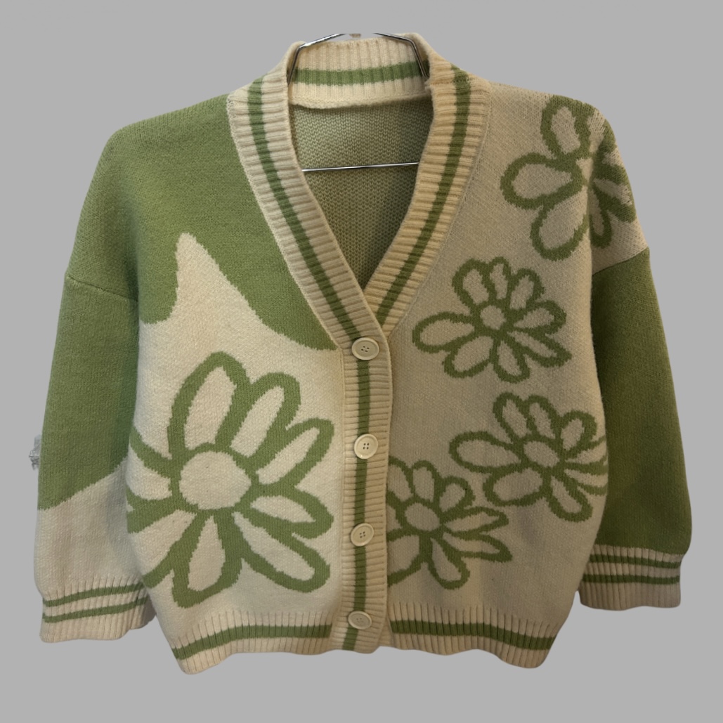 היקף – 107 ס״מ, אורך – 60 ס״מ , הרכב בד: 100% פוליאסטר סריג קרדיגן פרינט פרחים ירוקים מידה S מחמם ועבה עם כפתורים גדולים מחשוף וי