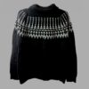 הדוגמה הגיאומטרית הלבנה שבחלקו העליון של הסריג שוברת את הגוון השחור הקלאסי ויוצרת עניין ויזואלי מיוחד. זהו פריט שבקלות הופך למוקד הלוק — לא משנה אם תלבשי אותו לעבודה, ליציאה עם חברות או לערב חורפי רגוע.