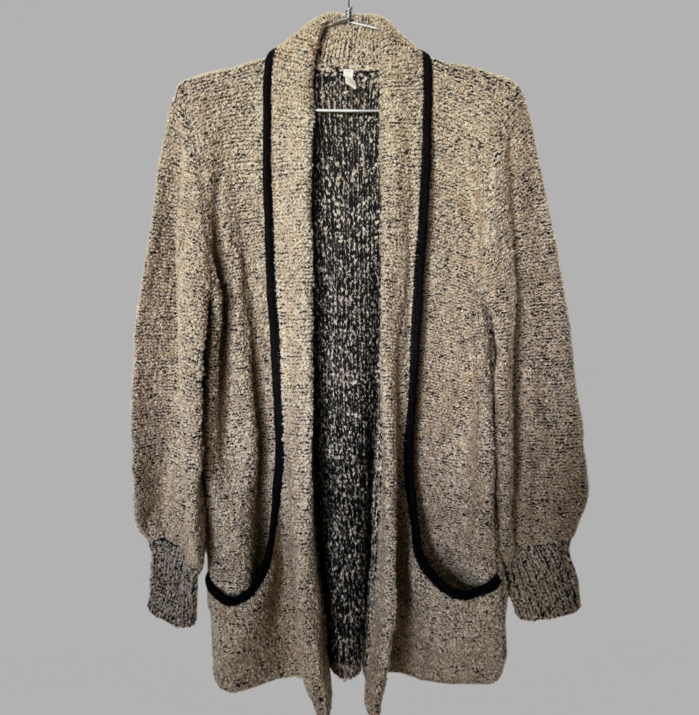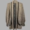 היקף – 110 ס״מ, אורך – 77 ס״מ, 100% פוליאסטר עליונית קרדיגן סריג חום מוקה ״מלוכלך״ עם שחור פתוח עם שרוולים מעט תפוחים. מצב טוב