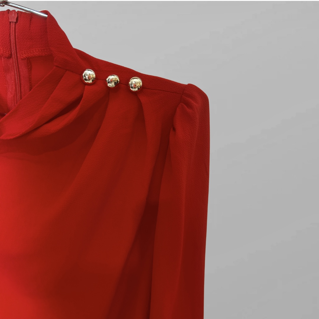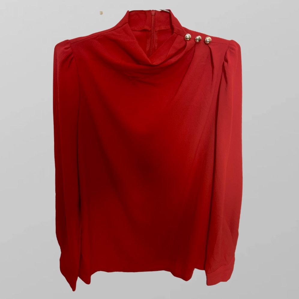 חולצה אלגנטית אדומה עם כפתורים מעוטרים בזהב וצווארון גבוה