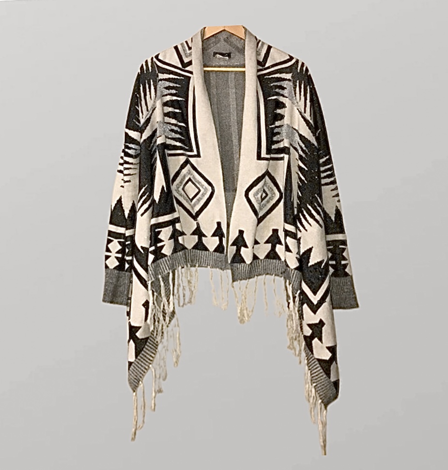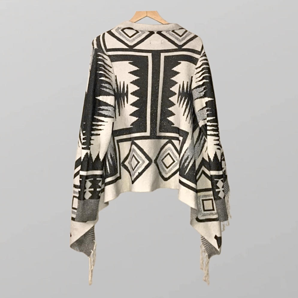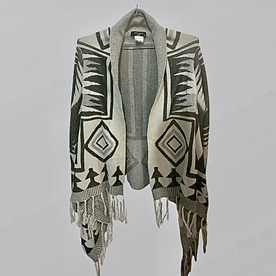 היקף – 140 ס״מ, אורך – 67 סמ קרדיגן סריג פתוח מודפס מנצנץ מעט שחור לבן עם פרנזים ושרוולים ארוכים איכותי מחמם ושימושי מאוד! ישתלב מעולה כמעט עם כל לוק שתבחרי