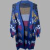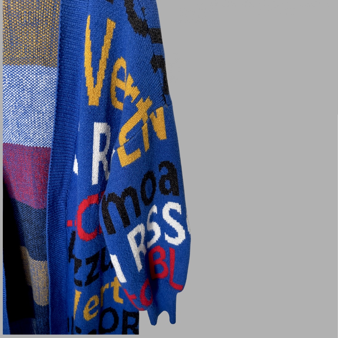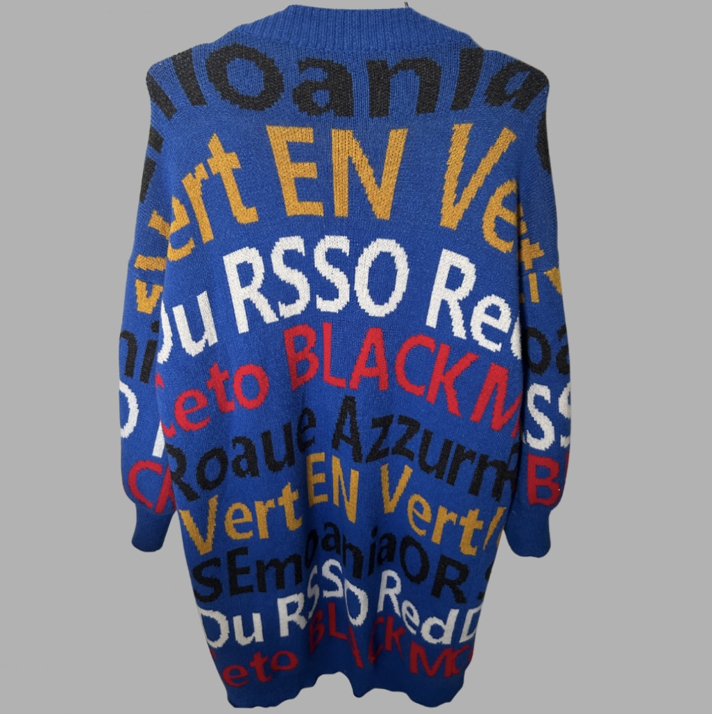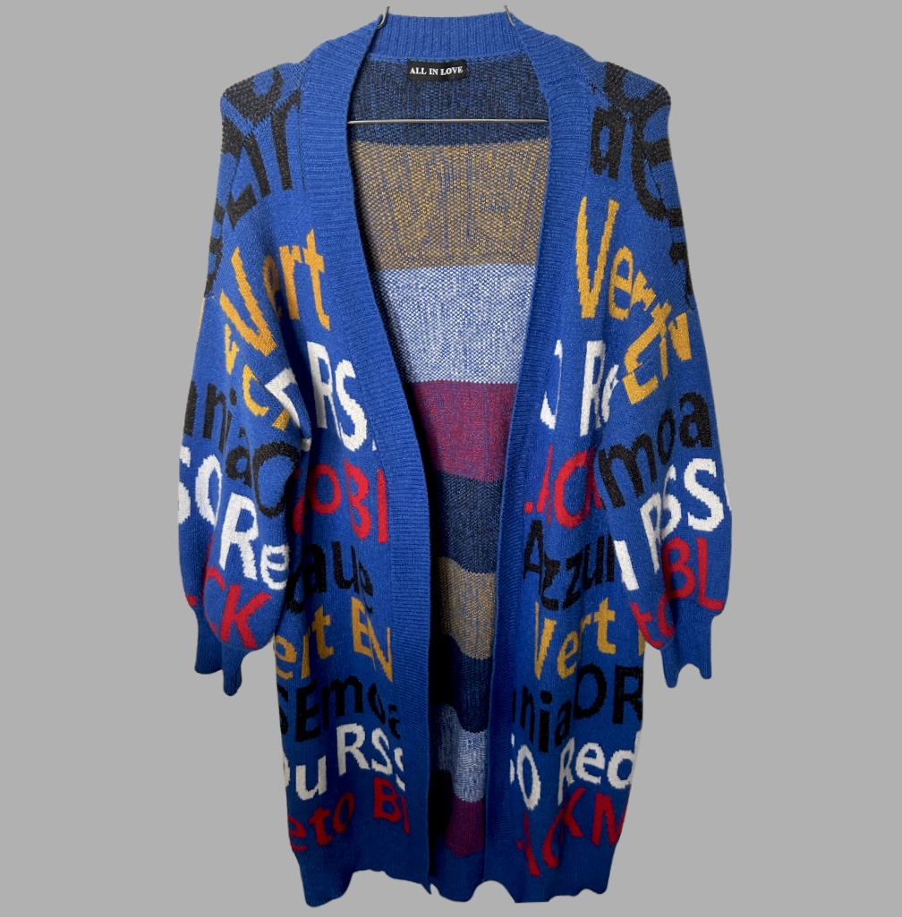 הקרדיגן שבתמונה הוא סריג ארוך וססגוני מבית ALL IN LOVE, בעל רקע כחול רויאל ועליו הדפס טיפוגרפי צבעוני במראה גרפי־מודרני. הוא עשוי סריג נעים ורך, בגזרת אוברסייז פתוחה עם שרוולים רחבים ונפוחים קלות. האלמנטים הצבעוניים — באדום, לבן, שחור וצהוב חרדל — יוצרים מראה אומנותי שמושך את העין. מתאים ללוק אורבני קליל או שכבה חמה ומלאת סטייל לימי מעבר