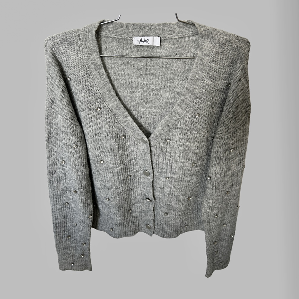 CASTRO מידה 40 קרדיגן אפור סריג עם אבנים דמוי יהלומים כפתורים ומחשוף וי