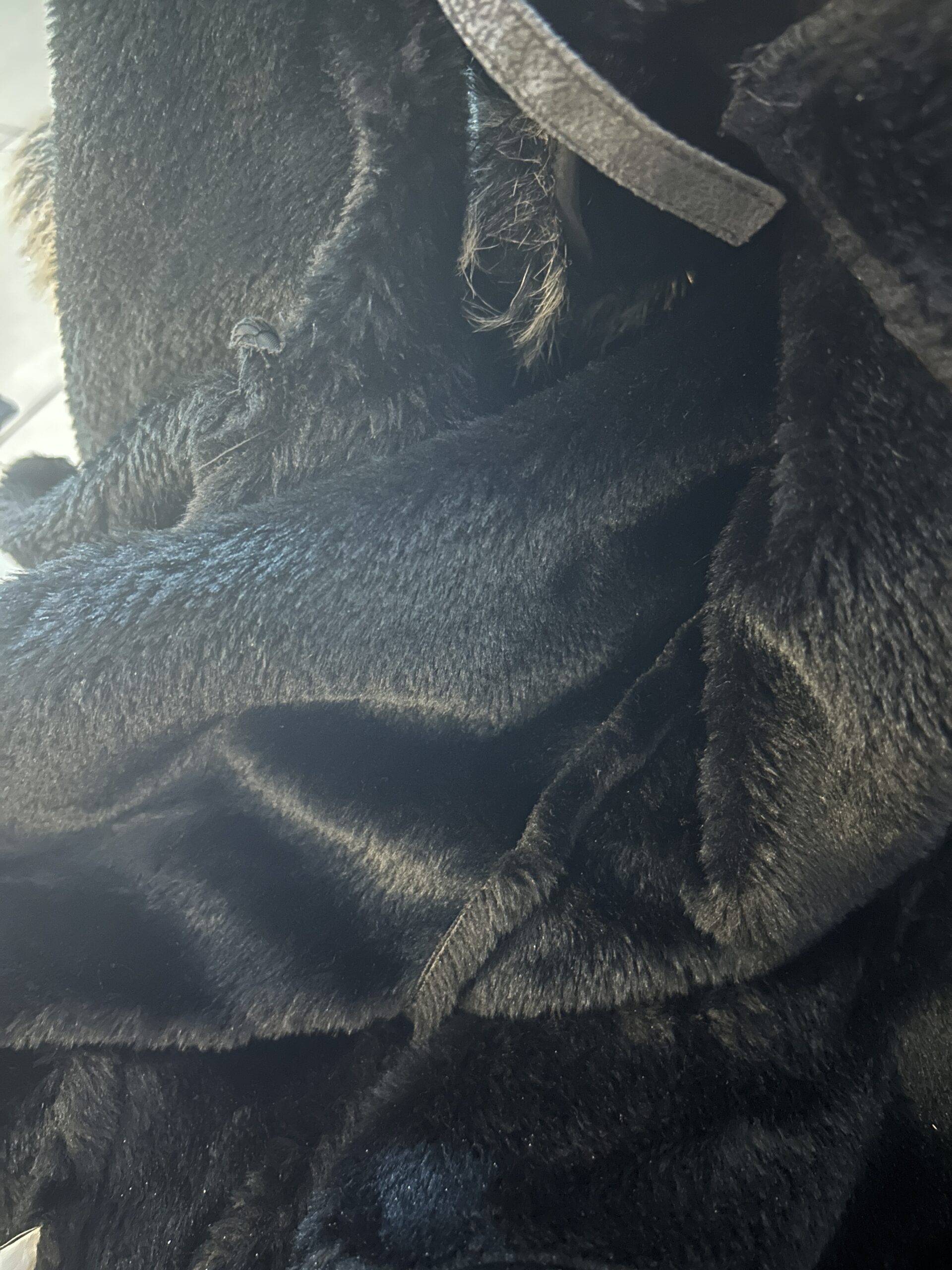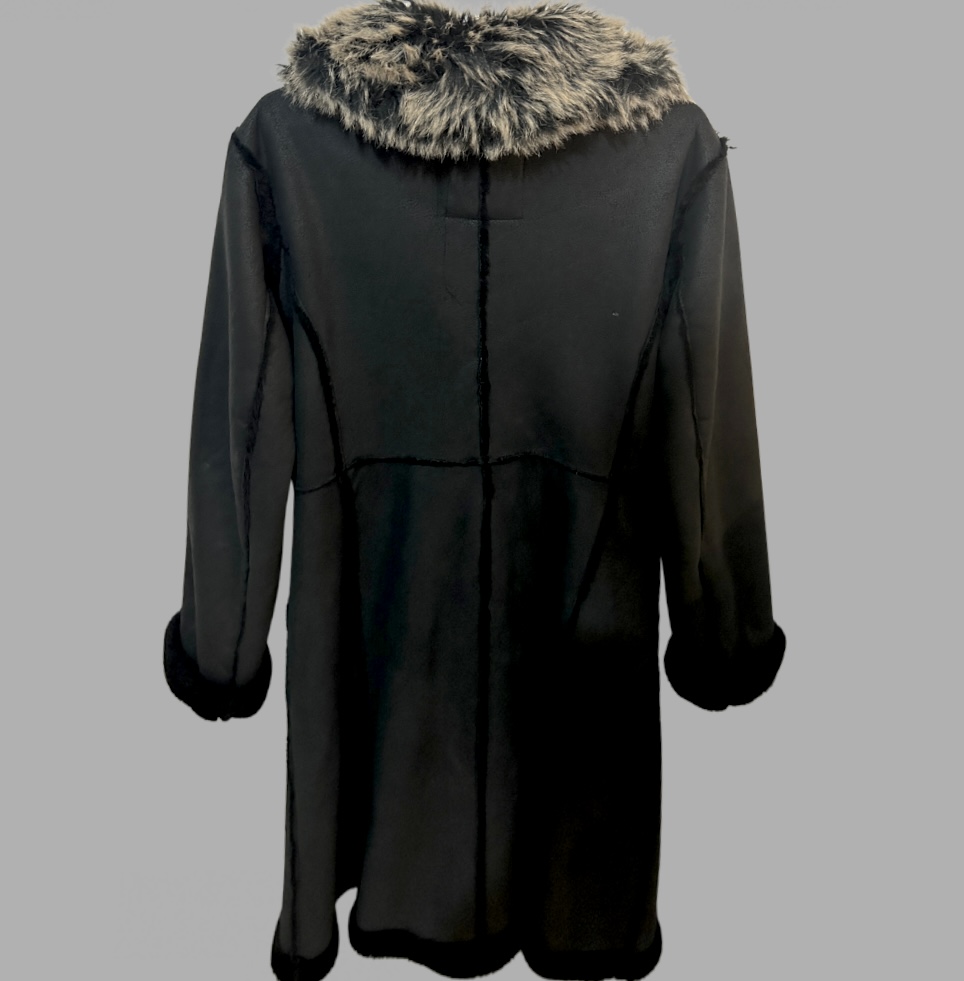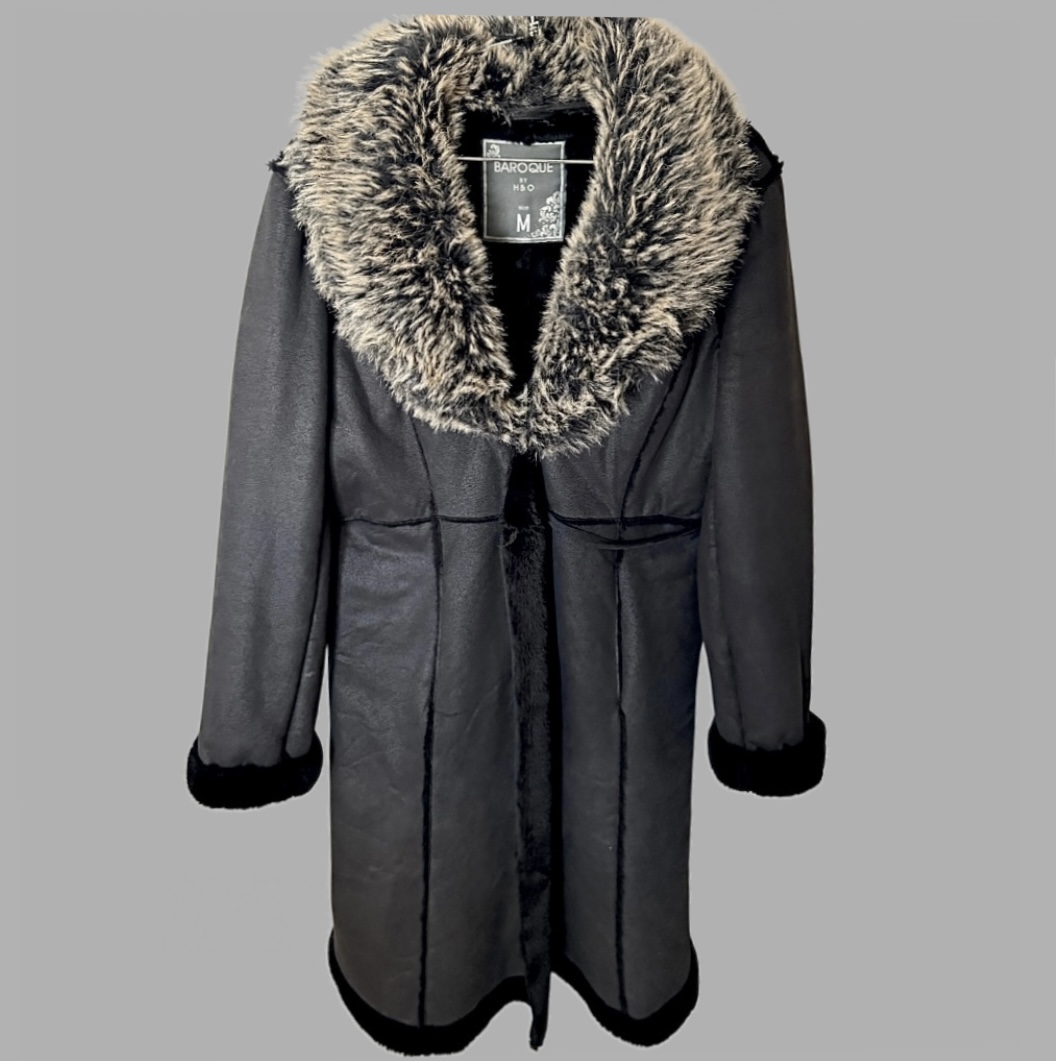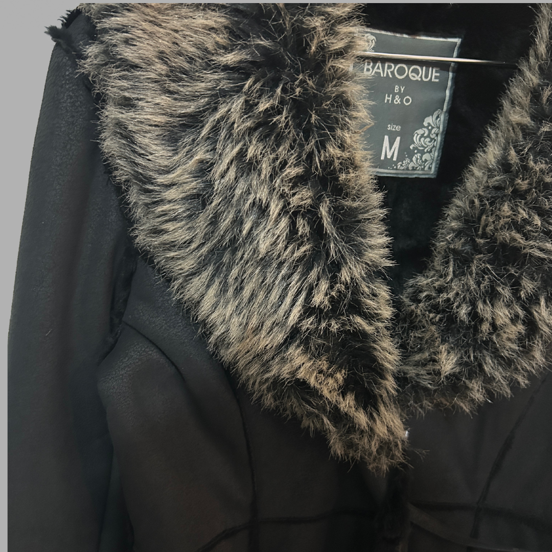 H&O מידה M מעיל דמוי זאמש שחור ארוך עם תיפורים בשילוב פרווה מלאכותית ורכה מחמם בפנים (כולל בתוך השרוולים) ופרווה מרשימה בצווארון, יש סגירת קרסים לאורך ופרווה בסיומת, מצב חדש