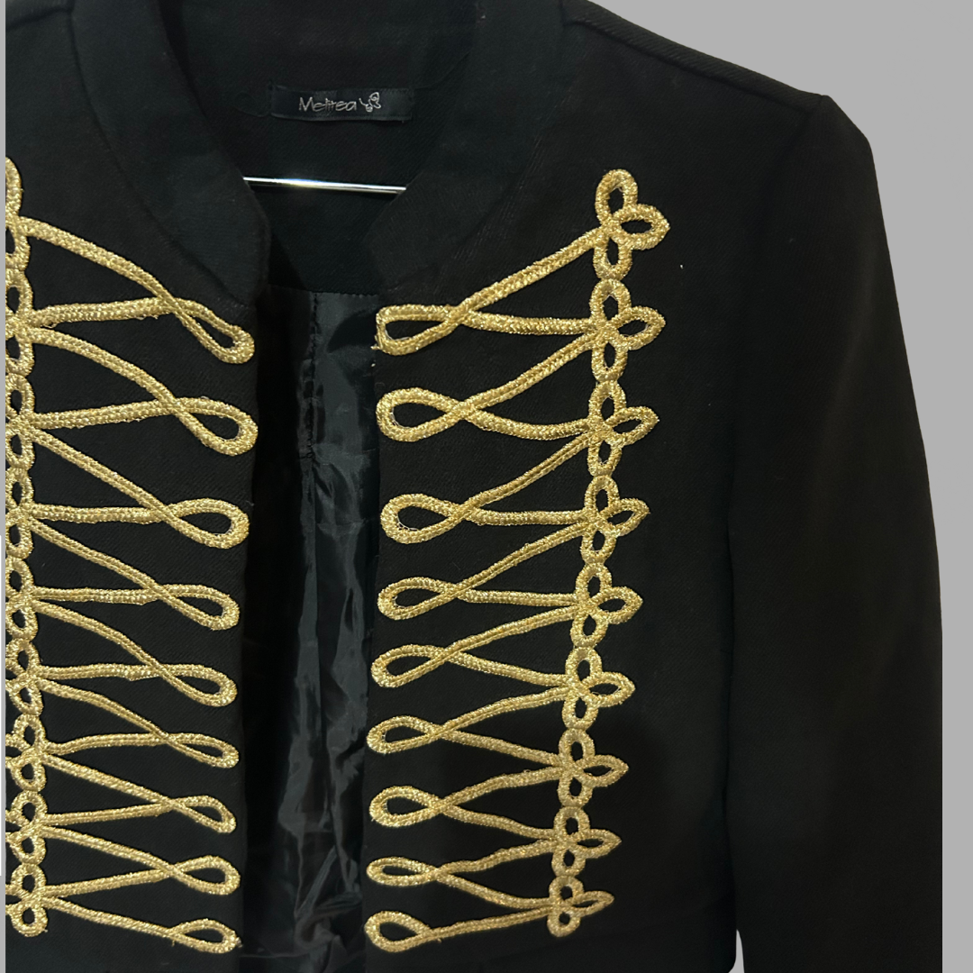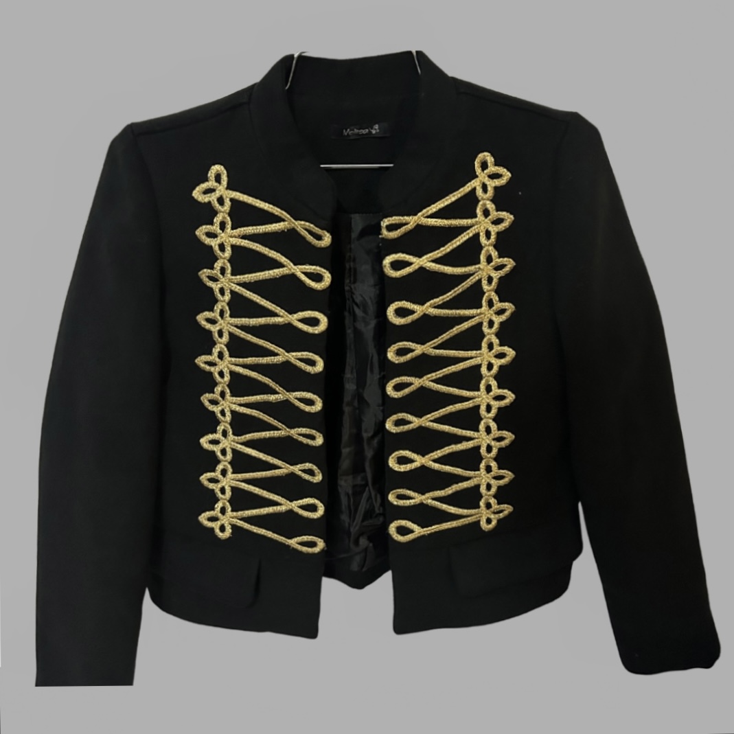 ג׳קט וינטג׳ שחור דמוי צמר צבאי-בוהמיאן מידה M רקמת חבלים מוזהבים בחזית תוצרת איטליה מצב חדש!