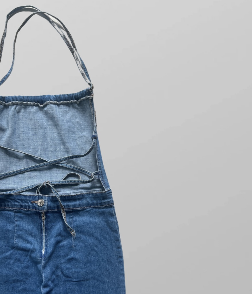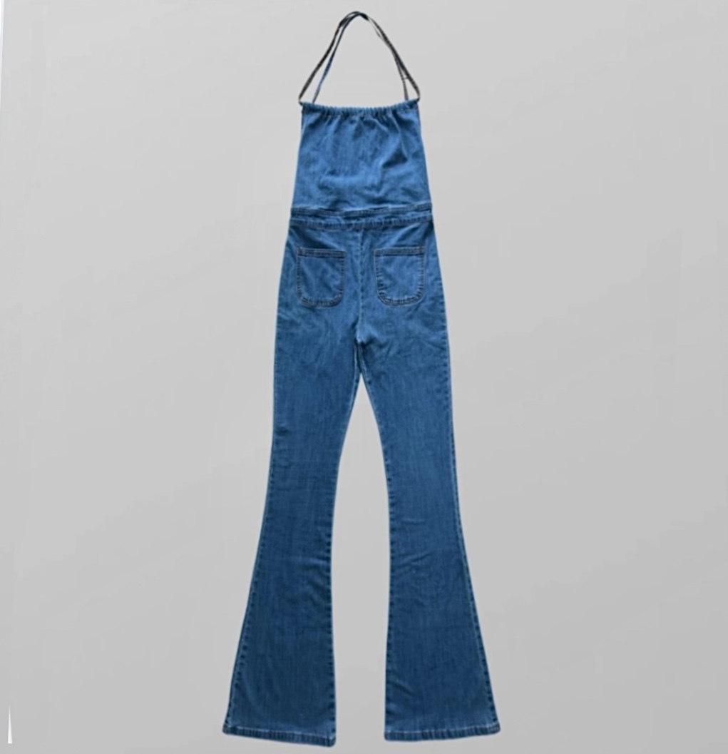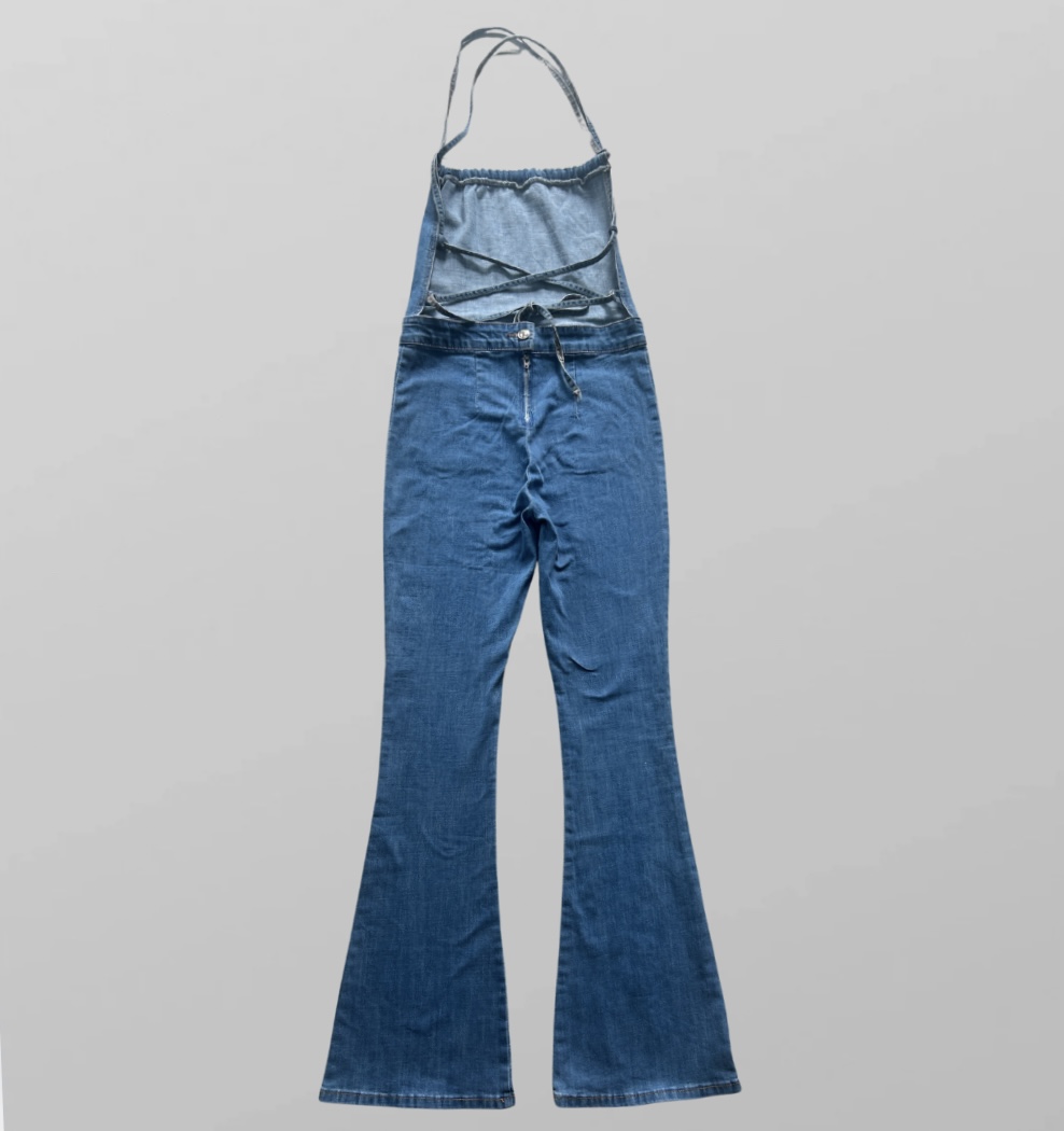 אוברול ג׳ינס ארוך לייקרה עם קולר וגב חשוף, מתרחב למטה מידה M עדיקה