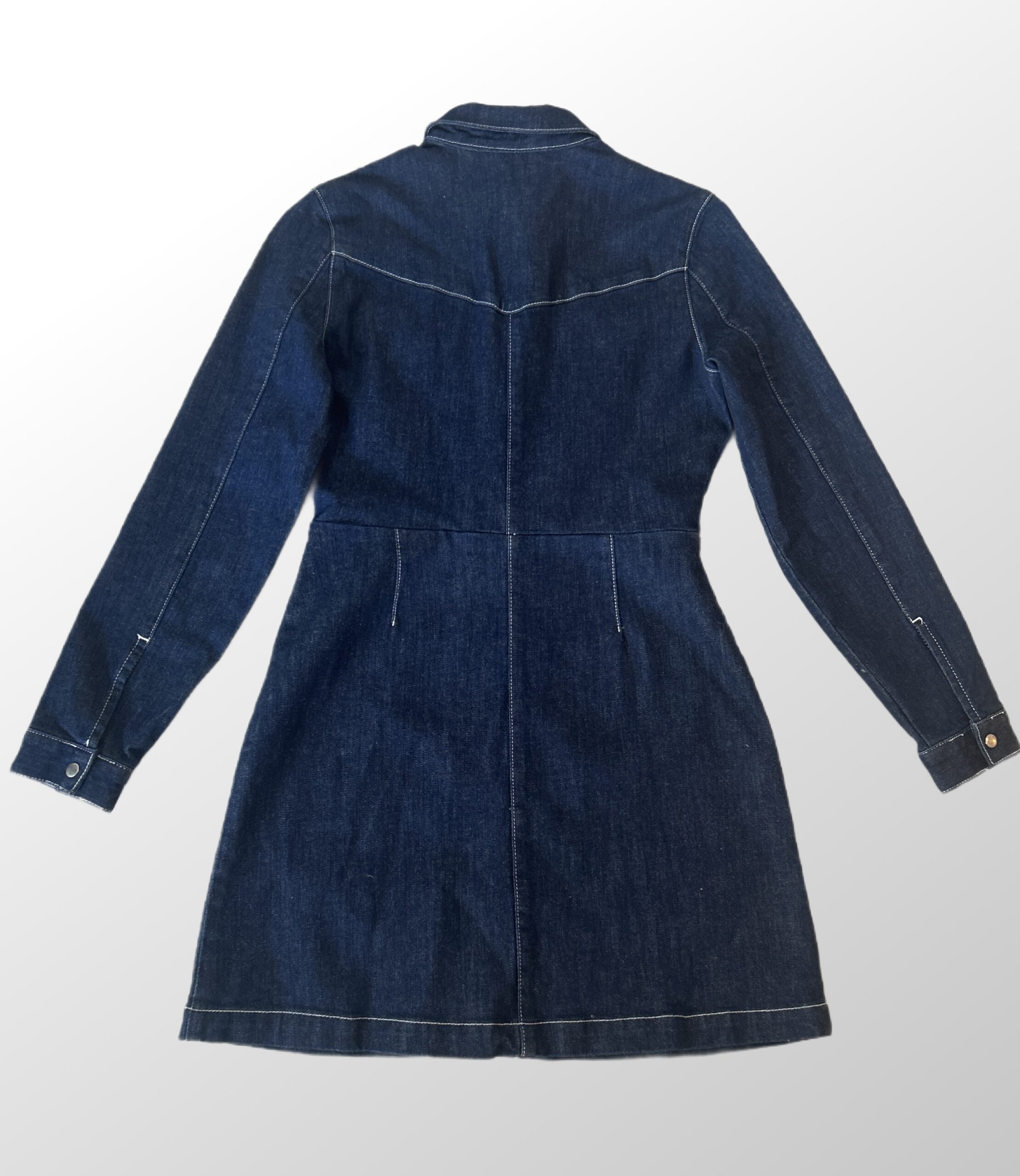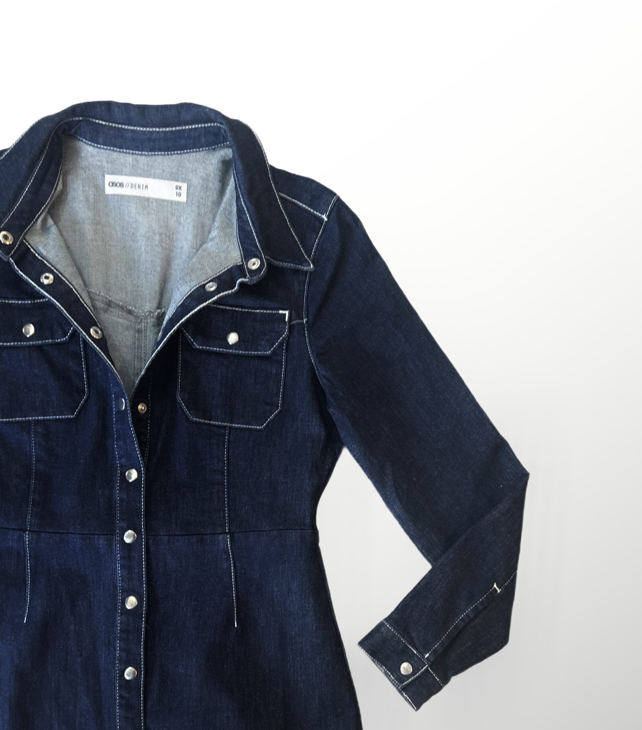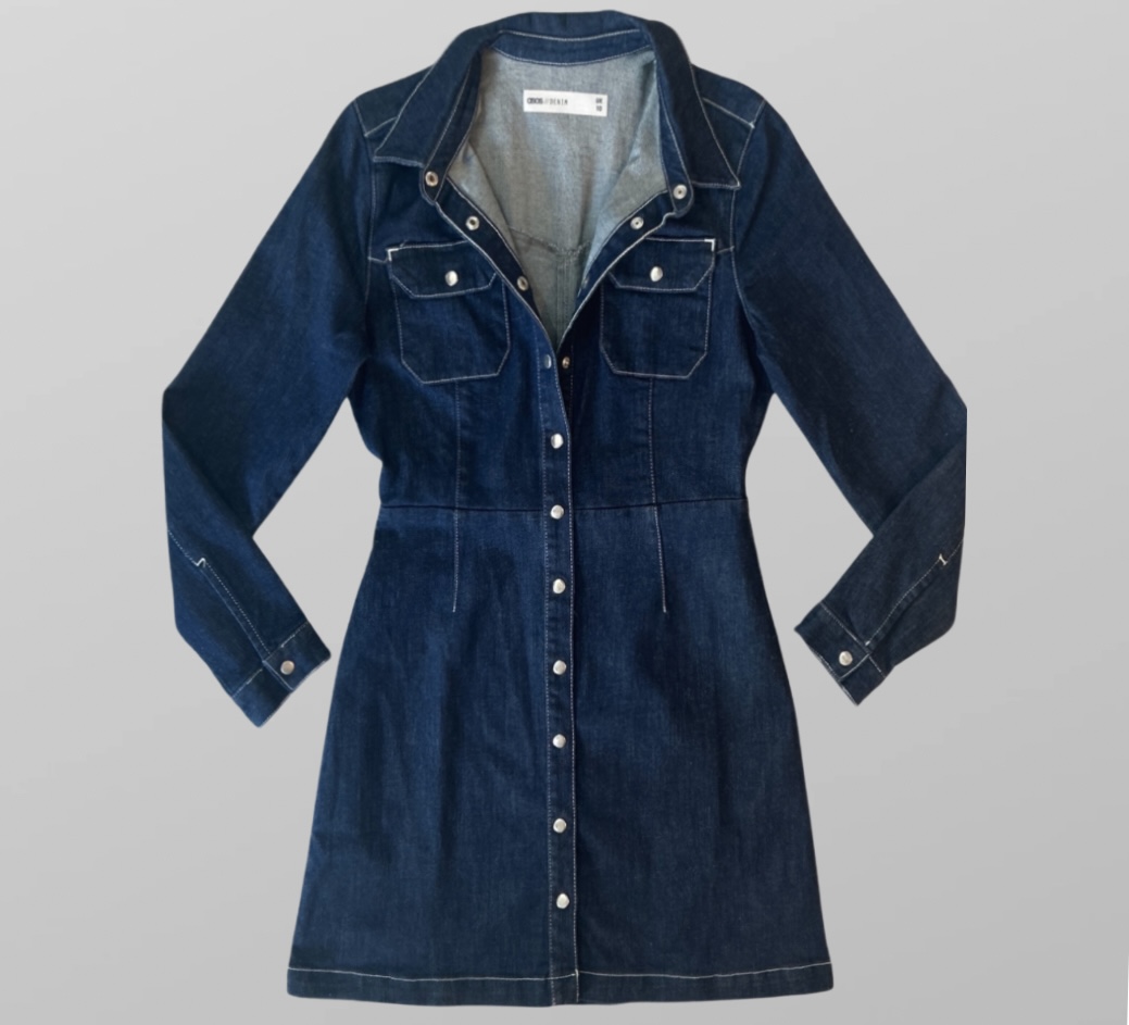 שמלת ג׳ינס סטרץ׳ בצבע כחול כהה, עם תיפורים מודגשים. שמלת מיני ג׳ינס בשילוב טיקטקים לכל האורך, שמלת ג׳ינס לייקרה יכולה לשמש כ שמלה לבילוי וגם כשמלה ליומיום! שמלת לייקרה מחטבת! שמלת ג׳ינס של אסוס מידה S (רשום M, אך קטנה)