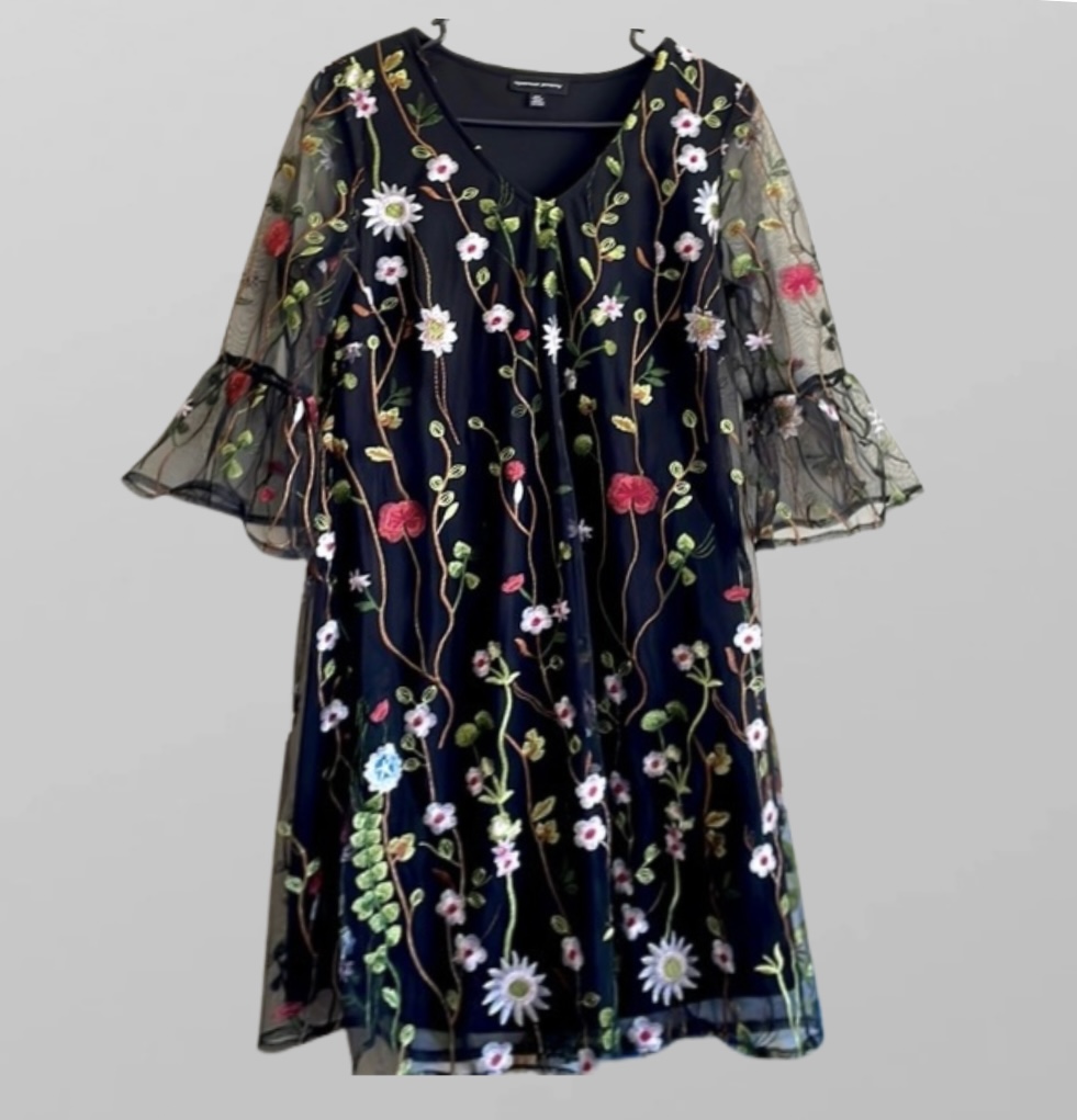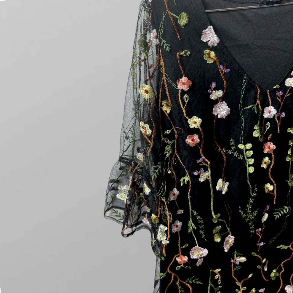 הפרחים הרקומים לאורך הבד מעניקים לה תחושת טבע וחיות, שמדגישה את הייחודיות שלה לעומת שמלות שחורות חלקות. הרקמה הצבעונית שוברת את המראה הדרמטי ויוצרת ניגודיות מושלמת שמרימה כל הופעה. השמלה מתאימה במיוחד לנשים שאוהבות פריטים שגורמים להן להרגיש מיוחדות – פריטים שיש בהם סיפור ועיצוב עשיר.