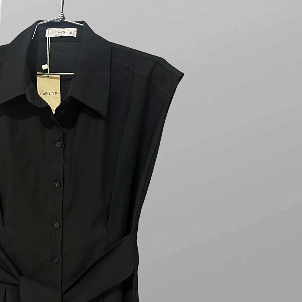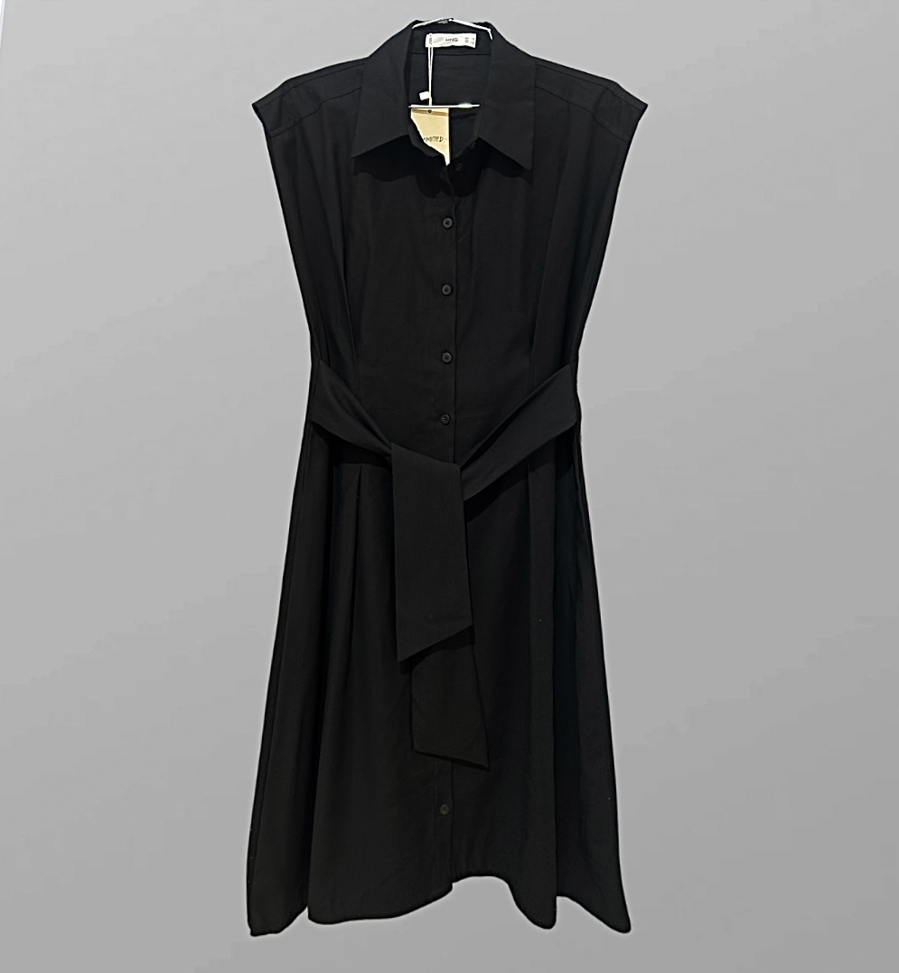 שמלה מחויטת שחורה באורך מידי בשילוב כפתורים לאורך וחגורת קשירה שניתנת לקשירה גם מקדימה וגם מאחורה