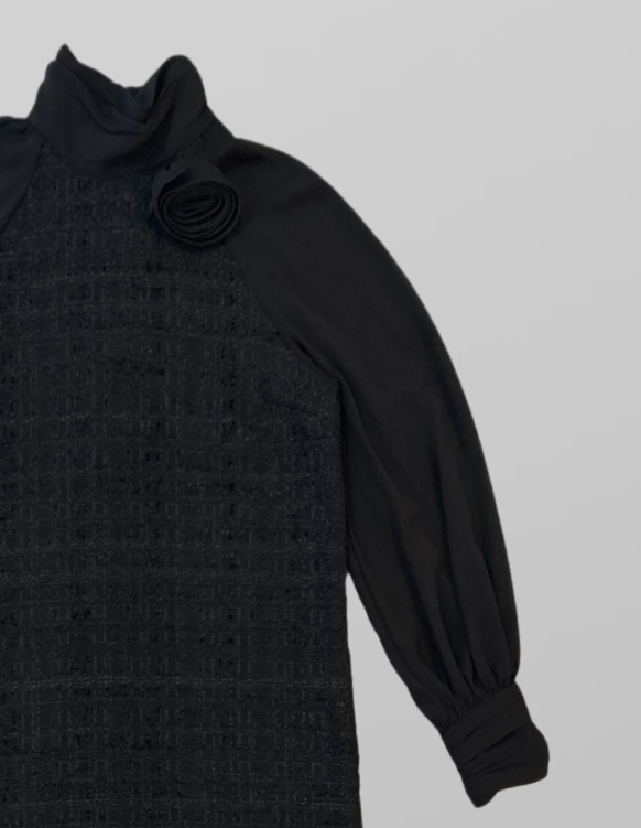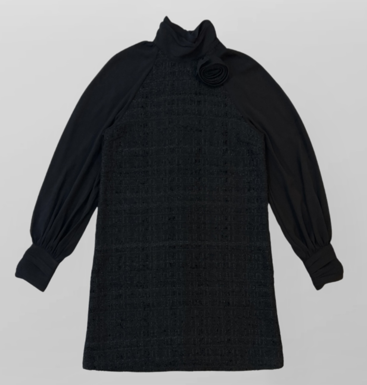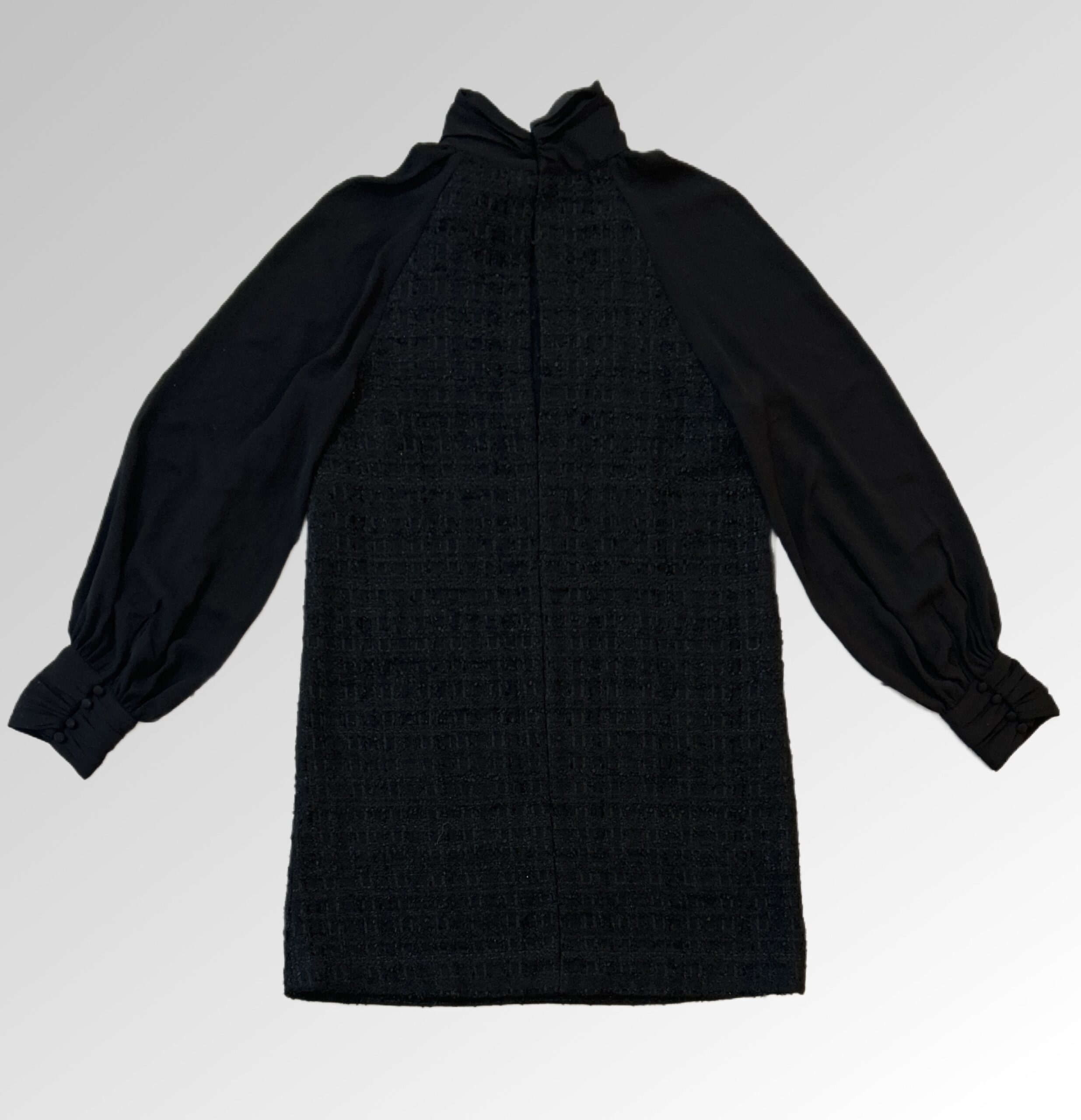 שמלת אלגנטית עם שרוולי שיפון קצת רחבים עם סיומת הדוקה עם כפתורים קטנים, ושושנה משיפון באזור הצווארון, טקסטורת סריג טיפה מנצנץ, צווארון גבוה עם כיווץ מעניין, שמלה המתאימה כ שמלת ערב או שמלה לארוע ואף לכל בילוי אחר! שמלה מיוחדת ומרשימה בגזרה ישרה ומחמיאה עם סגירת כפתורים קטנים מאחורה ופתח קטן! שמלה שחורה ושימושית בהחלט! מצב חדש!