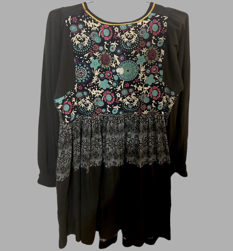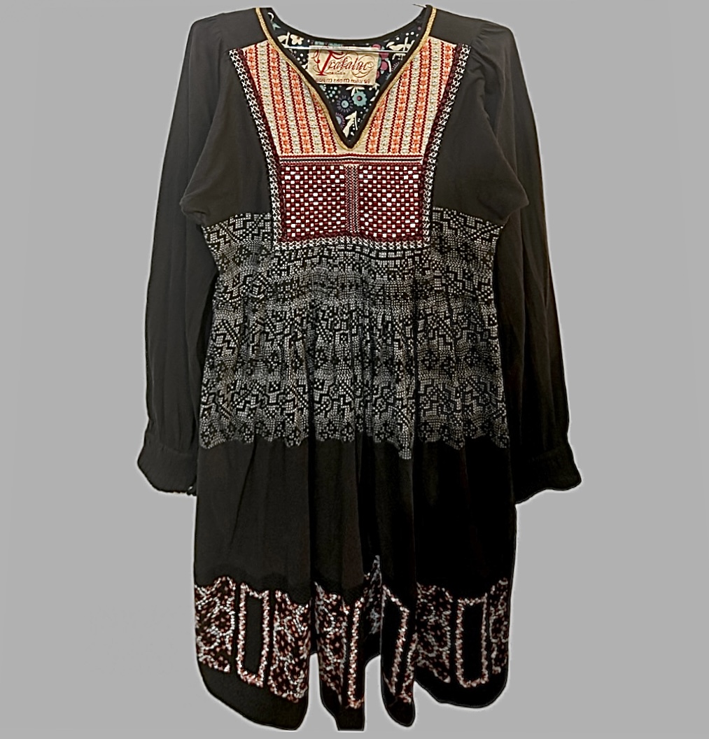 וינטג׳! שמלה בסגנון אתני רקומה מידה M אורך מידי בצבע אפור מקדימה והדפס פרחוני מאחורה